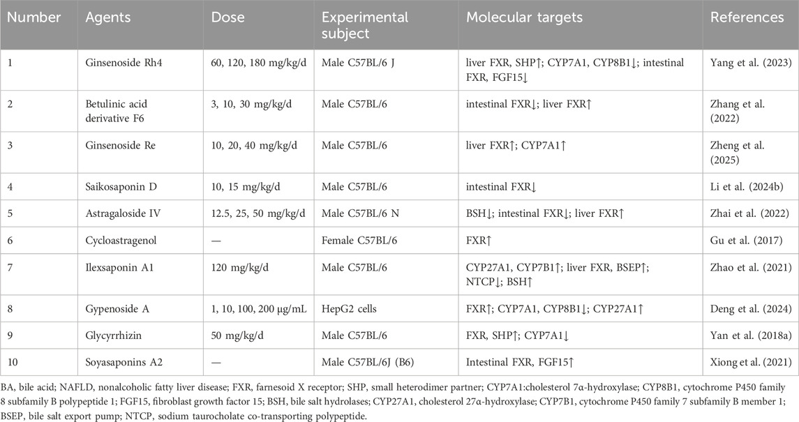 Finally, some saponins exhibited unique mechanisms. Glycyrrhizin reduced BA accumulation and partly ameliorated NASH not by directly enhancing FXR, but by restoring inflammation impaired FXR signaling, which in turn upregulated SHP and suppressed CYP7A1 (Yan et al., 2018a). Soyasaponin A2 increased ileal FXR/FGF15 signaling to enhance BA excretion in feces, while also rebalancing gut microbes (Xiong et al., 2021). This strategy, however, was constrained by its use of the MCD diet model and a lack of demonstrated causality between FXR activation and therapeutic efficacy.