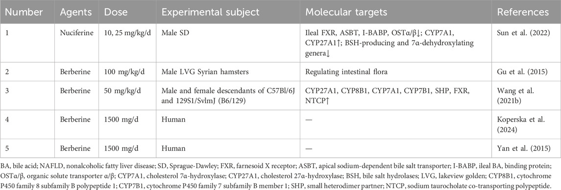 A key therapeutic approach involved the direct, coordinated modulation of the enterohepatic axis and the gut microbiota to correct BA dysregulation. For instance, the aporphine alkaloid nuciferine reduced hepatic lipid accumulation and injury by targeting both the enterohepatic axis and the gut microbiota. It downregulated ileal FXR and associated transporters (ASBT, I-BABP, OSTα/β) while upregulating hepatic BA synthesis enzymes (CYP7A1, CYP27A1), alongside suppressing BSH-producing and 7α-dehydroxylating bacteria to reshape gut microbiota (Sun et al., 2022). However, the limitation to male rats precluded an assessment of sex-based generalizability. Moreover, the proposed regulatory effect of the microbiota on BA deconjugation was not directly confirmed, as fecal BSH activity was not measured.