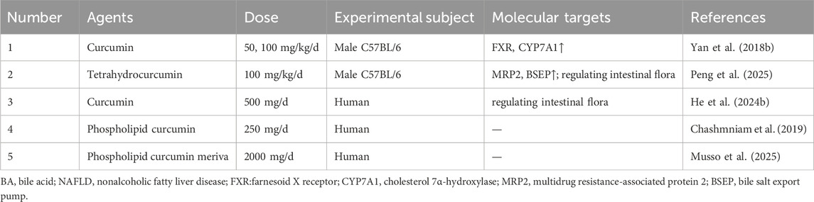 Initial preclinical work demonstrated that curcumin ameliorated hepatic steatosis by upregulating the expression of hepatic FXR and CYP7A1 and inhibiting the activity of LXRα (Yan et al., 2018b). However, the foundational study was limited by its exclusive use of male mice and a lack of focus on specific BA species or the enterohepatic circulation. Building on this, its major metabolite, tetrahydrocurcumin ameliorated NAFLD by reducing serum levels of toxic BAs, such as 7-keto-deoxycholic acid (7-KDCA) and CA, upregulating hepatic BA efflux transporters, including MRP2 and BSEP, decreasing the Firmicutes phylum, and increasing the Verrucomicrobiota phylum (Peng et al., 2025). This suggested a synergistic gut-liver axis effect, yet the study was constrained by its failure to verify the role of BA receptors or explore the microbiota’s influence on BA-transforming enzymes.