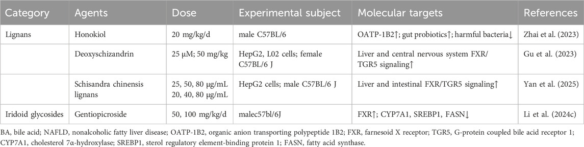 Building on this, other lignans targeted key nuclear receptors within the enterohepatic axis. Deoxyschizandrin improved NAFLD through activating hepatic and central nervous system FXR/TGR5 signaling and enhancing leptin sensitivity (Gu et al., 2023). However, the target specificity was not verified in gene knockout mice, and the efficacy was not compared with that of known FXR/TGR5 agonists. Similarly, schisandra chinensis lignans ameliorated NASH by activating the enterohepatic FXR/FGF15 signaling axis, modulating the gut microbiota, reducing hepatic BA accumulation, and promoting fecal BA excretion (Yan et al., 2025). While the study precisely defined the composition of the Schisandra lignan mixture and quantified the proportion of each metabolite, it failed to identify the specific lignans responsible for the core regulatory effects on FXR and BA metabolism, nor did it validate the causal role of the gut microbiota through FMT.