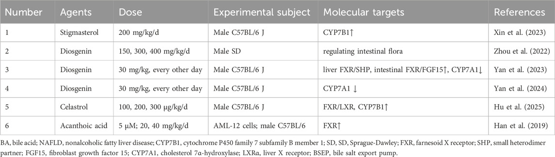 Similarly, celastrol and acanthoic acid were investigated for their potent effects on BA signaling, though with distinct mechanistic focuses and limitations. Celastrol ameliorated cholestasis by activating the FXR/LXR signaling axis, leading to the upregulation of CYP7B1 and a correction of the toxic/non-toxic BA imbalance (Hu et al., 2025). However, its investigation was confined to male mice and overlooked the potential contribution of the gut microbiota. In a parallel line of inquiry, acanthoic acid activated FXR and LXRs, suggesting the FXR-LXR axis is an effective target for NAFLD (Han et al., 2019). Nevertheless, the study was limited by the exclusion of female mice, a lack of direct quantification of BA species, and the absence of validation for key downstream enzymes and transporters.
