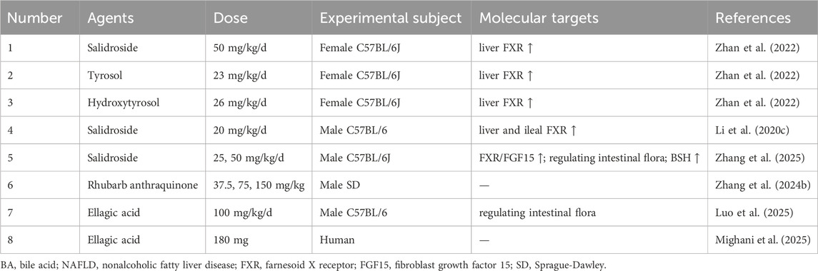 For instance, several phenolics, salidroside, tyrosol, and hydroxytyrosol were shown to attenuate hepatic steatosis by upregulating hepatic FXR, maintaining BA homeostasis, and modulating the gut microbiota (Zhan et al., 2022). Among them, salidroside has been the subject of particularly detailed investigation, revealing multiple, nuanced mechanisms of action. One study demonstrated that salidroside ameliorated NASH by modulating the gut microbiota, which rectified BA metabolism by decreasing colonic toxic/conjugated BAs (such as DCA, TCA and tauro-α/β-muricholic acid (Tα/β-MCA)) and increasing β-CDCA, ultimately activating the hepatic and ileal FXR signaling axis, as well as the ileal FGF15 signaling axis (Li et al., 2020c). Nevertheless, the investigation was restricted to male mice and failed to establish whether the FXR/FGF15 pathway was essential for the observed therapeutic effects. A complementary mechanism for salidroside was proposed in another study, which found that it ameliorated NASH by upregulating the abundance of Bacteroidota and Bacteroides in the gut microbiota, enhancing fecal BSH activity, reducing hepatic levels of conjugated BAs, such as Tα/β-MCA, and activating FXR and TGR5 (Zhang et al., 2025). While the study rigorously established this molecular mechanism through FMT, antibiotic intervention, and inhibitor experiments, it was limited to male mice and did not explore the specific molecular mechanism by which Bacteroides regulates BSH activity.