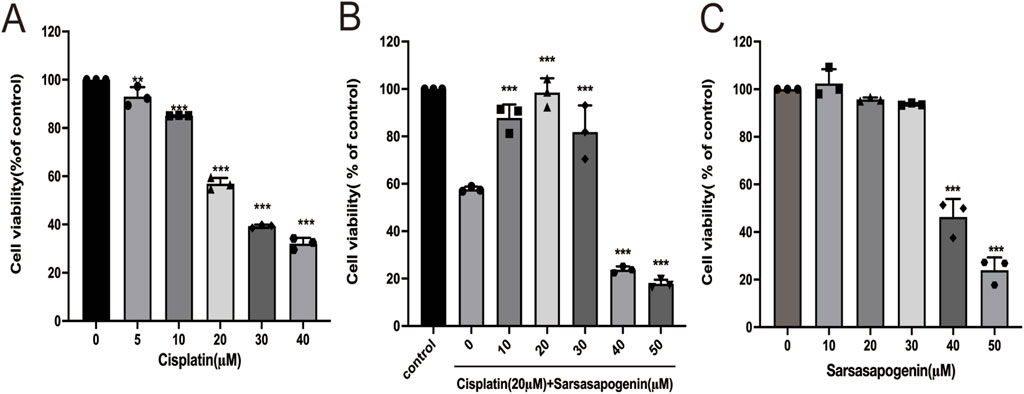 HEI-OC1 cells were harvested by trypsinization with 0.25% trypsin/EDTA followed by centrifugation at 1,000 rpm for 3 min. The collected cells were resuspended in fresh culture medium and seeded in 96-well plates at a density of 4,000 cells per well, with three replicates for each condition. After a 24-h incubation period, the culture medium was replaced with medium containing different concentrations of cisplatin (0, 5, 10, 20, 30, and 40 μM) or sarsasapogenin (0, 10, 20, 30, 40, and 50 μM) and 20 μM cisplatin along with different concentrations of sarsasapogenin (0, 10, 20, 30, 40, and 50 μM). Cell viability was assessed at different incubation times (0.5–2 h) using the CCK-8 assay kit (NCM Biotech, C6005, China) to evaluate the cytoprotective effects of sarsasapogenin under cisplatin-induced stress.