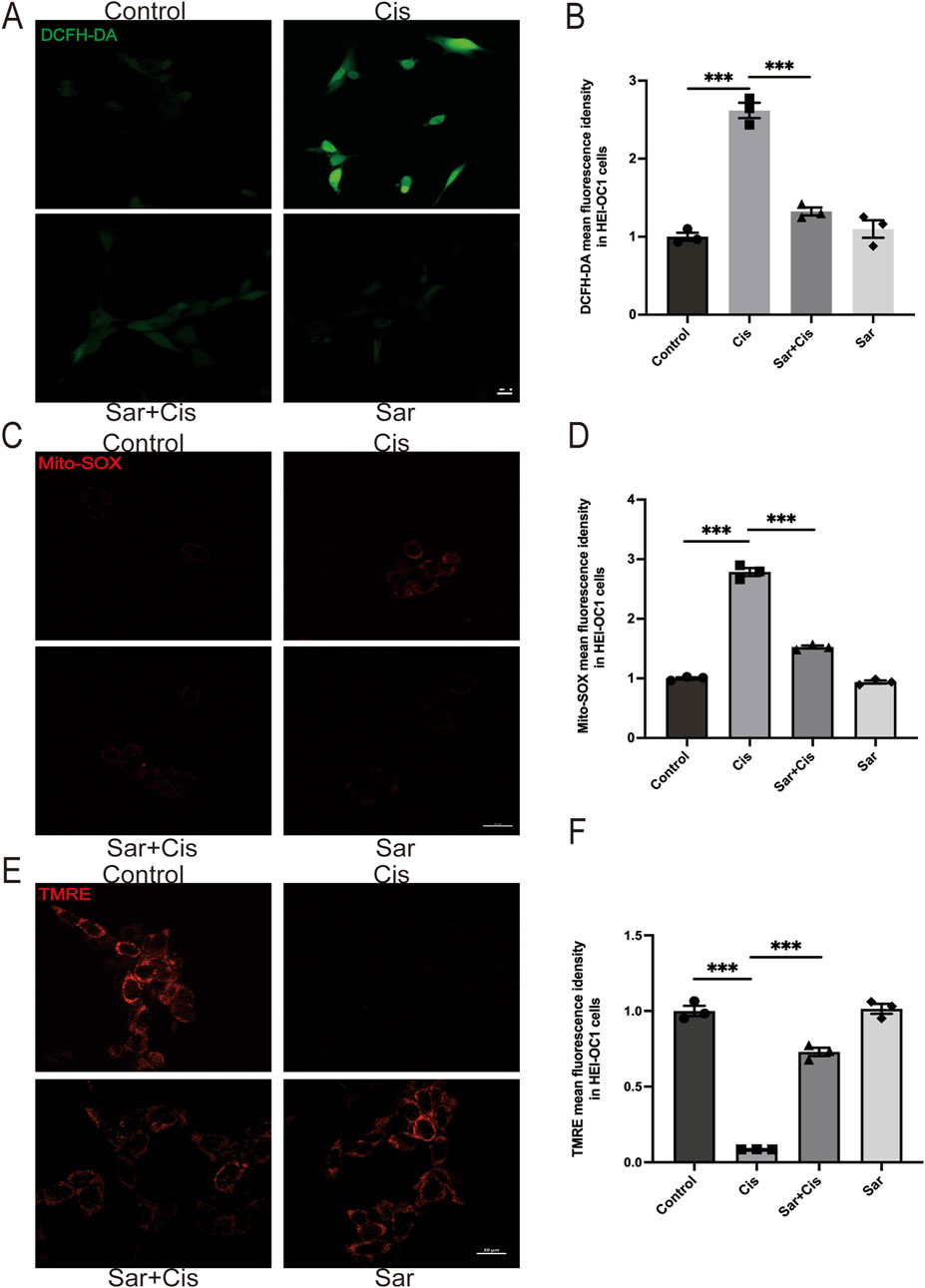 Figure 3. Sarsasapogenin inhibits cisplatin-induced oxidative stress and mitochondrial dysfunction in HEI-OC1 cells. (A) ROS production was increased by cisplatin and suppressed by cotreatment with sarsasapogenin (n = 3). (B) Quantitative analysis of DCFH-DA. (C) Mito-SOX staining showed that the increased mitochondrial ROS levels in HEI-OC1 cells after cisplatin treatment were alleviated by sarsasapogenin treatment (n = 3). (D) Quantitative analysis of Mito-SOX. (E) TMRE staining showed that the decreased MMP in HEI-OC1 cells after cisplatin treatment was restored by sarsasapogenin treatment (n = 3). (F) Quantitative analysis of TMRE. ***p < 0.001. Scale bars: 20 µm.