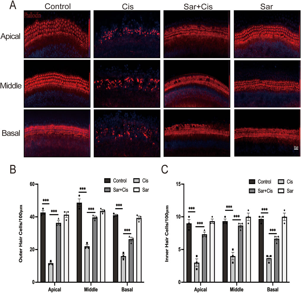 Figure 4. Effects of sarsasapogenin on cisplatin-induced damage to cochlear HCs. (A) Immunofluorescence staining for phalloidin and DAPI showing the number of HCs in different cochlear turns after different treatments (n = 3). (B) Quantitative analysis of phalloidin and DAPI-positive OHCs in A. (C) Quantitative analysis of phalloidin and DAPI-positive IHCs in A. ***p < 0.001. Scale bars: 20 µm.