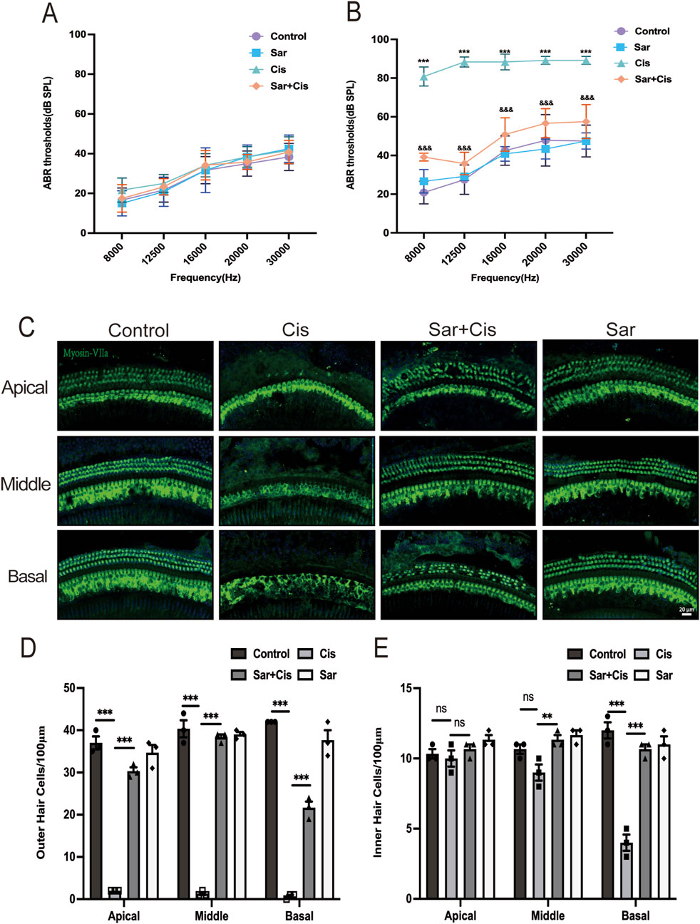 Figure 5. Sarsasapogenin ameliorates cisplatin-induced hearing loss and cochlear hair cell damage in vivo. (A) There was no difference in the ABR hearing threshold of C57BL/6J mice in the different groups before treatment (n = 6). (B) Transtympanic injection of sarsasapogenin significantly reduced the ABR threshold caused by cisplatin at 8, 12.5, 16, 20 and 30 kHz (n = 6). ***p < 0.001 versus the control group; &&&p < 0.001 versus the cisplatin group. (C) Whole-mount sections were labeled with myosin-VIIa (green) and DAPI (blue). Sarsasapogenin treatment significantly improved HCs loss in all turns (n = 3). (D) Quantitative analysis of surviving OHCs from different turns. (E) Quantitative analysis of surviving IHCs from different turns. ns, not significant, ** p < 0.01, ***p < 0.001. Scale bars: 20 µm.