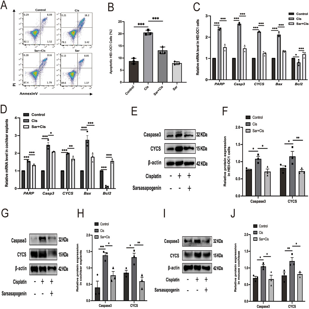 Figure 6. Sarsasapogenin suppresses cisplatin-induced apoptosis in vitro and in vivo. (A) Flow cytometry results showing the apoptosis rates in the different groups (n = 3). (B) Quantitative analysis of the flow cytometry results in A. (C) The mRNA expression profiles of apoptotic markers including PARP, Casp3, CYCS, Bax, and antiapoptotic marker Bcl2 in HEI-OC1 cells after different treatments (n = 3). The values of qPCR were normalized to β-actin and averaged. (D) The mRNA expression of PARP, Casp3, CYCS, Bax, and Bcl2 in cochlear explants after different treatments (n = 3). The values of qPCR were normalized to β-actin and averaged. (E) WB results showing the expression levels of caspase 3 (n = 3) and CYCS (n = 3) in the different groups in HEI-OC1 cells. (F) Quantitative analysis of the Western blot results in E. (G) WB results showing the expression levels of caspase 3 (n = 3) and CYCS (n = 3) in the different groups in cochlear explants. (H) Quantitative analysis of the Western blot results in G. (I) WB results showing the expression levels of caspase 3 (n = 3) and CYCS (n = 3) in the different groups in mouse cochleae. (J) Quantitative analysis of the Western blot results in I. * p < 0.05, ** p < 0.01, ***p < 0.001.