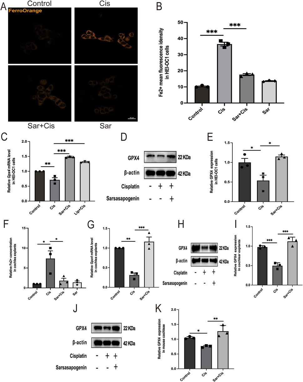 Figure 7. Sarsasapogenin alleviates cisplatin-induced ferroptosis in vitro and in vivo. (A) FerroOrange staining showed that the increased Fe2+ levels in HEI-OC1 cells after cisplatin treatment were alleviated by sarsasapogenin treatment (n = 3). (B) Quantitative analysis of FerroOrange staining. (C) The mRNA expression of the ferroptosis-related gene Gpx4 in HEI-OC1 cells after different treatments (n = 3). The values of qPCR were normalized to β-actin and averaged. (D) WB results showing the expression levels of GPX4 (n = 3) in the different groups in HEI-OC1 cells. (E) Quantitative analysis of the Western blot results in D. (F) The significant increase in tissue-associated Fe2+ levels after cisplatin treatment in cochlear explants was alleviated by sarsasapogenin treatment (n = 3). (G) The mRNA expression of the ferroptosis-related gene Gpx4 in cochlear explants after different treatments (n = 3). The values of qPCR were normalized to β-actin and averaged. (H) WB results showing the expression levels of GPX4 in the different groups in cochlear explants (n = 3). (I) Quantitative analysis of the Western blot results in H. (J) WB results showing the expression levels of GPX4 in the different groups in mouse cochleae (n = 3). (K) Quantitative analysis of the Western blot results in J. *p < 0.05, **p < 0.01, ***p < 0.001. Scale bars: 20 µm.