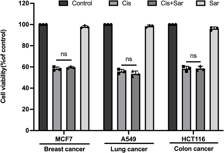 Figure 8. Sarsasapogenin has no effect on cisplatin’s ability to induce cancer cell death. CCK-8 assay showing the cell survival of several cancer cell lines treated with a combination of sarsasapogenin and cisplatin (n = 3). ns, not significant.