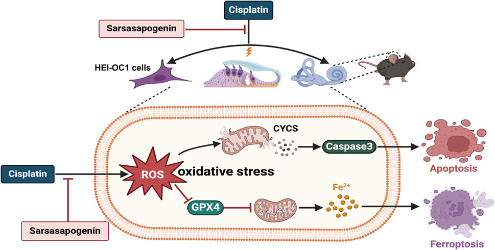 In summary, our study demonstrated for the first time that sarsasapogenin ameliorated cisplatin-induced ototoxicity by attenuating oxidative stress and preventing mitochondrial dysfunction. Mechanistically, the protective function of sarsasapogenin is attributed to the inhibition of apoptosis and ferroptosis both in vitro and in vivo (Figure 9). Furthermore, transtympanic delivery of sarsasapogenin in animal models demonstrated its potential to prevent cisplatin-induced ototoxicity, warranting further investigation in future studies. This study suggests that sarsasapogenin may serve as a promising therapeutic option for the prevention of cisplatin-induced ototoxicity.
