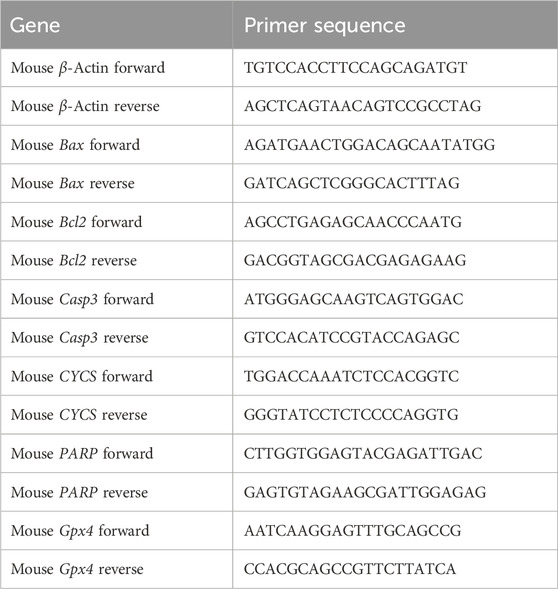 Total ROS and mitochondrial ROS (mtROS) levels were measured using DCFH-DA (Beyotime, SOO33S, China) and MitoSOX Red (Thermo Fisher, M36008, United States), respectively. Mitochondrial membrane potential (MMP) was assessed using Tetramethylrhodamine ethyl ester perchlorate (TMRE, Beyotime, C2001S, China) according to the manufacturer’s instructions. FerroOrange staining was performed according to the manufacturer’s protocol using the FerroOrange kit (Dojindo, F374-10, Japan). First, samples were fixed in 4% paraformaldehyde (Sangon Biotech, Shanghai) for 1 h at room temperature to preserve cell integrity, followed by three washes with 0.01 M phosphate-buffered saline (PBS) (Sangon Biotech, Shanghai) to remove residues to remove fixative. Subsequently, permeabilization with 1% Triton X-100 (Solarbio Life Sciences, T8200, China) was performed for 30 min at room temperature to facilitate antibody access to the cells. To block nonspecific binding, samples were incubated with 5% bovine serum albumin (BSA; Solarbio Life Sciences, A8010, China) for 1 h. After blocking, samples were incubated with primary antibodies diluted 1:100 or 1:500 for 12 h at 4°C. After incubation with primary antibodies, samples were washed three times with PBS and incubated with secondary antibodies (ImmunoWay, RS3211, RS3611, RS3208 and RS3608, United States) for 1 h at room temperature. Finally, samples were washed three times after secondary antibody incubation. Cells were stained with DAPI (Abcam, ab104139, United Kingdom) to visualize nuclei, mounted on slides and prepared for imaging. Confocal microscopy was performed using an LSM 800 confocal microscope (Zeiss, Germany) to capture high-resolution images. All images were processed and analysed using the ImageJ software.