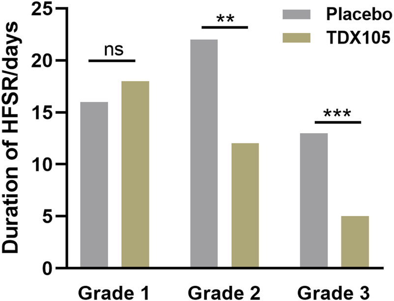 Duration of grades 1–3 HFSR in the experimental (TDX105) group and control (placebo) group.