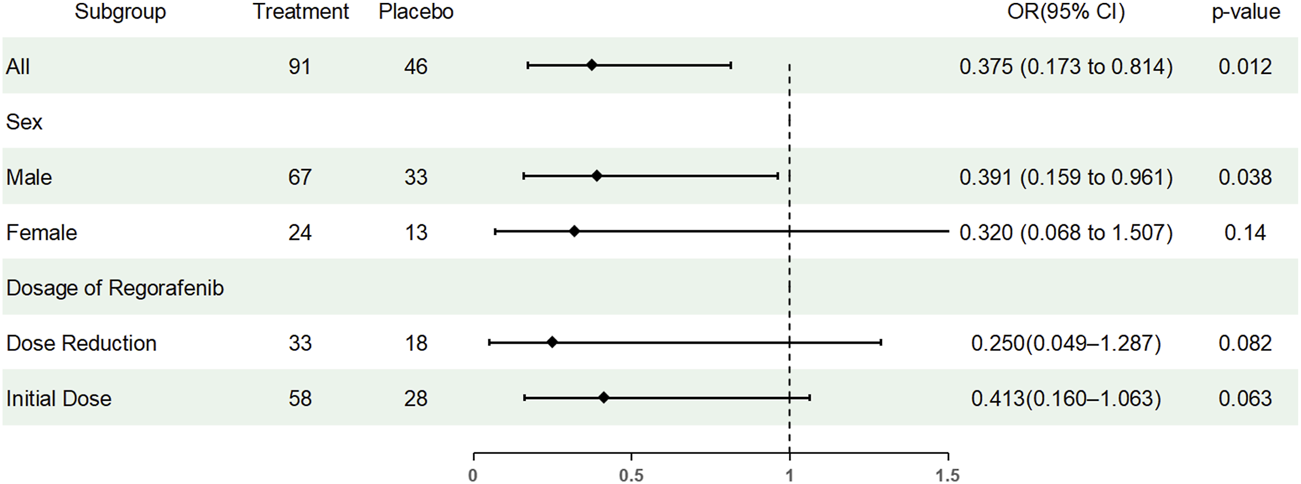 In the experimental group and control group, 17 and 9 patients, respectively, received Regorafenib at a dose of 160 mg/day. However, due to the high incidence of dose reduction and treatment interruption caused by Regorafenib-induced side effects, such as liver damage, diarrhea, hypertension, mucositis, and skin lesions, the dose of Regorafenib was reduced for all other patients. Ultimately, the other 74 patients in the experimental group and 37 patients in the control group took Regorafenib at a lower dose of 120 mg/day. All patients completed 8 weeks of treatment, with 66.4% receiving TDX105% and 33.6% receiving placebo treatment. The baseline demographic and clinical characteristics of patients in the two groups were comparable, as shown in Table 2.