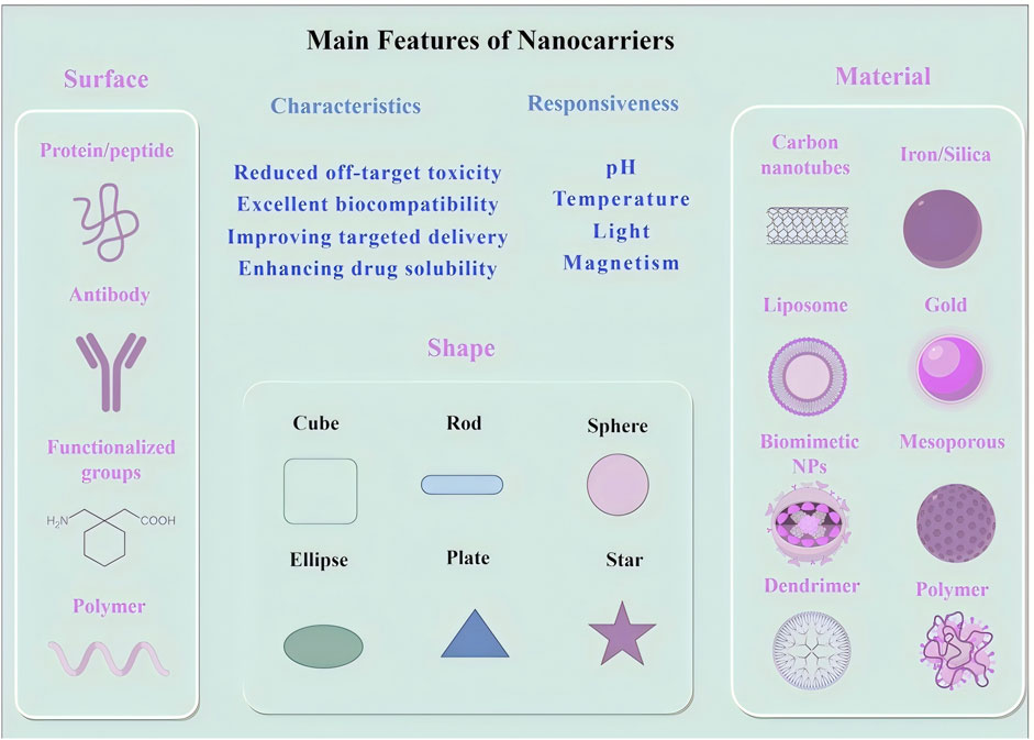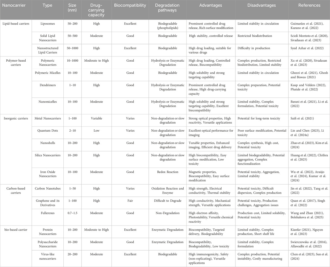 Nanotechnology has introduced innovative drug delivery strategies that are transforming cancer treatment by improving drug stability, solubility, and bioavailability. A diverse range of nanocarriers, including liposomes, polymeric nanocarriers, inorganic nanocarriers, and carbon-based materials, have been developed to enhance the precision and efficiency of oncological drug delivery (Garbayo et al., 2020; Vazhappilly et al., 2021) (Table 1 summarizes the characteristics of different nanocarrier types). Among these, liposomes constitute one of the earliest and most extensively utilized nanocarrier systems. Liposomes, composed of a phospholipid bilayer, can encapsulate both hydrophilic and hydrophobic agents. Their intrinsic ability to fuse with cellular membranes enables direct transport of therapeutic agents into tumor cells (Zhou et al., 2016; Vazhappilly et al., 2021). Polymeric nanocarriers, often synthesized from biodegradable polymers such as poly (lactic-co-glycolic acid) (PLGA), enable controlled drug release at tumor sites, thereby maintaining therapeutic concentrations while reducing systemic toxicity (Lin et al., 2023; Beach et al., 2024). Inorganic nanocarriers, such as gold-based or silica-based systems, exhibit unique physicochemical properties that enable their application in both therapeutic and diagnostic modalities (theranostics). For example, gold nanocarriers are particularly effective in photothermal therapy (Yang et al., 2020; Miao et al., 2022; Hirschbiegel et al., 2023). Carbon-based nanocarriers, such as carbon nanotubes and fullerenes, are structurally robust and capable of penetrating dense tissue matrices, thereby facilitating drug delivery into deep-seated tumors (Tang et al., 2021; Kaurav et al., 2023). Moreover, nanocarriers derived from natural biomaterials, such as protein-based nanocarriers and virus-like nanocarriers (VLPs), mimic viral architectures to promote cellular uptake. These carriers are biodegradable and display low immunogenicity, rendering them promising candidates for clinical translation (Zhang et al., 2017; Habibi et al., 2022; Tenchov et al., 2022) (Figure 1 illustrates the principal features of different nanocarrier types).