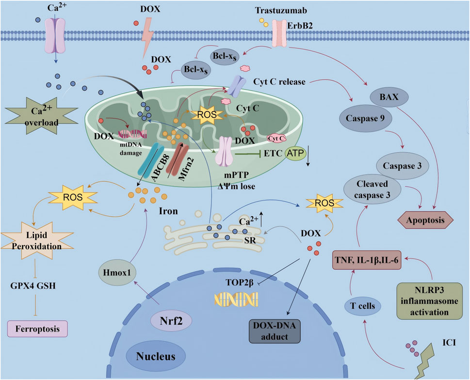Recent studies have highlighted ferroptosis as a central mechanism contributing to CIC. DOX, along with agents such as cisplatin and sorafenib, disrupts iron homeostasis, suppresses GPX4 and GSH, and activates ACSL4, collectively leading to iron overload, lipid peroxidation, and cardiomyocyte ferroptosis (Ding et al., 2023). Trastuzumab-induced activation of SLC7A11 appears to further sensitize cardiomyocytes to ferroptotic death (Zhang et al., 2023). Inflammation emerges as another critical factor: anticancer agents activate cardiac macrophages and recruit circulating monocytes, neutrophils, and T cells, which in turn release TNF-α, IL-1β, IL-6, chemokines, and reactive species, thereby exacerbating cardiomyocyte injury, fibrosis, and adverse remodeling. Notably, immune checkpoint inhibitors may provoke autoimmune-like myocarditis characterized by extensive T-cell infiltration (Wei et al., 2021; Zhao et al., 2025).