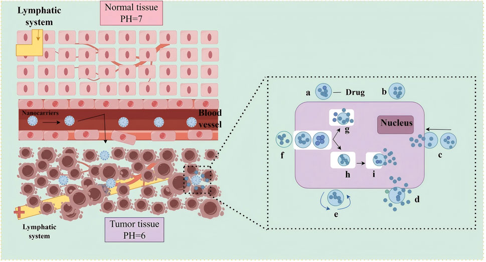 Nanocarriers employ both passive and active targeting mechanisms. Passive targeting is mediated by the enhanced permeability and retention (EPR) effect, which allows nanocarriers of 10–200 nm in size to preferentially accumulate in tumor tissues due to their leaky vasculature (Allawadhi et al., 2022; Singh et al., 2022; Chen et al., 2023; Sun et al., 2024), as shown in Figure 3. This selective distribution reduces systemic exposure, minimizes off-target toxicity, and enhances therapeutic efficacy. For instance, stimuli-responsive nanocarriers have been designed to release their drug payload in response to the acidic tumor microenvironment. These carriers remain stable under physiological pH (7.0) but release drugs efficiently at lower pH (5.0–6.5) (Liu et al., 2014). A dextran–DOX conjugate, for example, released only 11% of its payload at pH 7.4, compared to 96% at pH 4.0 (Behera and Padhi, 2022). This controlled release improves drug efficacy at tumor sites while protecting healthy tissues, including cardiomyocytes (Zhang et al., 2020; Yu et al., 2021).