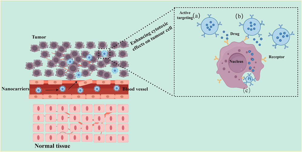 Figure 4. Schematic illustration of active targeting drug delivery using nanocarriers. Left: Schematic showing nanonanocarrier extravasation and tumor targeting. Nanocarriers modified with target ligands (blue stars) circulate through blood vessels, cross the abnormal tumor vasculature (dashed red arrows), and specifically bind to tumor cell surface receptors (orange Y-shaped structures), while being excluded from normal tissue (bottom) due to lack of target receptors. Right: Three active targeting delivery modes: (a) Proximity release: nanocarriers release drugs in the tumor microenvironment upon receptor binding; (b) Membrane depot: Ligand-receptor interaction anchors nanocarriers to the cell membrane for sustained drug release; (c) Receptor-mediated endocytosis: nanocarriers are internalized into tumor cells, delivering drugs directly to intracellular targets (e.g., nucleus). Key feature: Active targeting relies on specific ligand-receptor interactions (e.g., antibody-antigen, peptide-receptor), enabling selective drug accumulation in tumor tissues while minimizing uptake by normal cells.