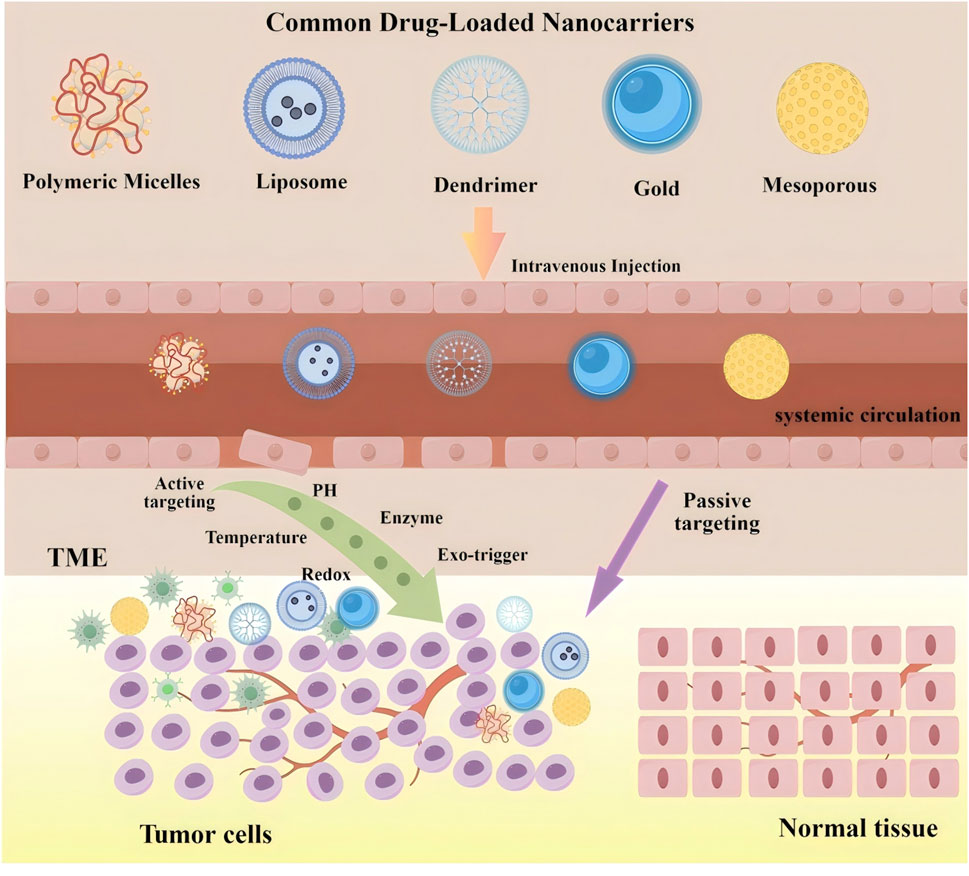 Figure 5. The process of nanocarriers as drug carriers acting on cancer cells. The upper shows structural diversity of common drug-loaded nanocarriers (left to right: polymeric micelles, liposomes, dendrimers, gold nanocarriers, mesoporous nanocarriers) as versatile drug encapsulation platforms. The lower depicts three-stage in vivo delivery: (1) Systemic circulation-intravenous injection enables bloodstream entry and systemic distribution; (2) tumor targeting via dual mechanisms: passive targeting (purple arrow, EPR effect-mediated extravasation across disorganized tumor vasculature) and active targeting [green arrow, triggered by TME cues (pH, enzymes, redox) or exogenous stimuli (temperature, light)]; and (3) Intratumoral action-drug release within the tumor microenvironment (TME) for selective cancer cell interaction while sparing normal tissues. Critical to this process, TME-established pathophysiological gradients (e.g., acidic pH, elevated enzyme levels) provide spatiotemporal control signals for stimuli-responsive nanocarriers. This multi-stage paradigm integrates dual targeting to overcome biological barriers, enhancing cancer therapeutic index.