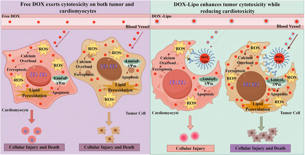 Figure 6. Pathological Mechanisms of Free DOX vs DOX-Lipo in Cardiomyocytes and tumor Cells. In DOX therapy, the use of free DOX often results in simultaneous damage to both cardiomyocytes and tumor cells due to its lack of selectivity, leading to significant cardiac toxicity and adverse effects. On the other hand, DOX-Lipo enhances the drug’s targeting ability, promoting tumor cell apoptosis and death while reducing cardiac toxicity. DOX,Doxorubicin; DOX-DNA adduct,Doxorubicin-DNA adduct; DOX-Lipo, Doxorubicin Liposome; ΔΨm, Mitochondrial Membrane Potential; TOP2β, Topoisomerase 2 beta.