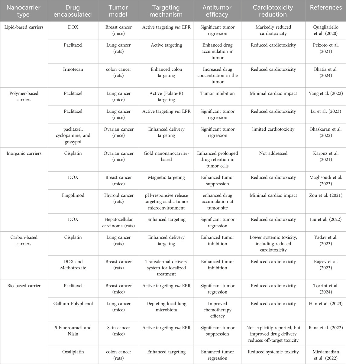 The focus on targeting precision, functionalization, and biocompatibility provides a strong foundation for next-generation nanocarrier-based cancer therapies with improved safety profiles. Nonetheless, preclinical research has inherent limitations. Many studies rely on small sample sizes, which reduce statistical power and generalizability. Rodent models also differ physiologically from humans, limiting the accuracy with which they replicate human cardiotoxicity mechanisms and pharmacokinetics. Moreover, most studies are of short duration and cannot adequately assess long-term cardiac effects. These constraints emphasize the need for cautious interpretation of preclinical results and highlight the challenges of translating findings directly to clinical applications (L’Abbate et al., 2022). Table 2 summarizes key findings from animal studies employing different nanocarrier systems, providing an overview of their therapeutic potential and safety. Collectively, these investigations suggest that nanocarrier-based strategies could enhance anticancer efficacy while reducing cardiac and systemic toxicities.