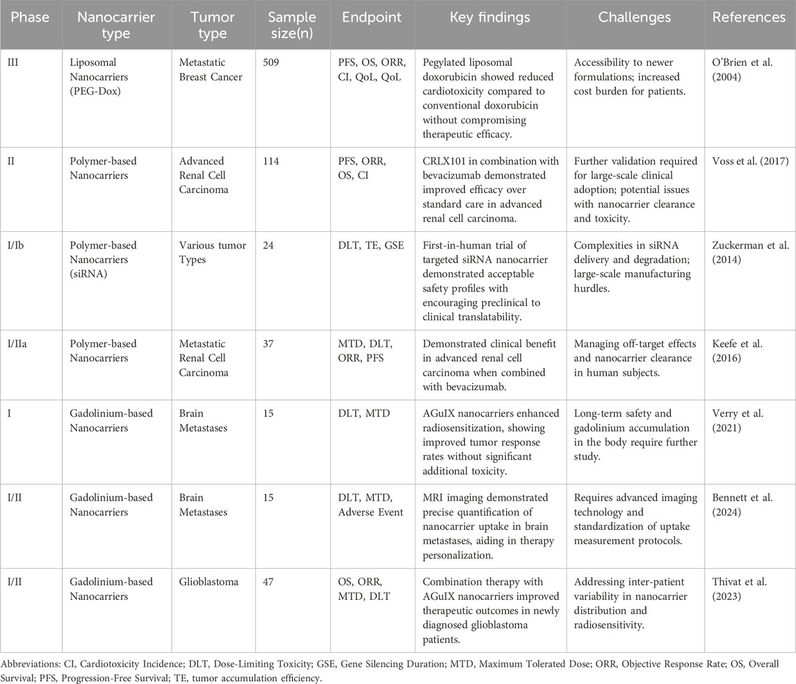 The growing body of clinical evidence highlights the potential of nanocarriers to improve cancer treatment outcomes while mitigating cardiotoxicity. Table 3 summarizes key clinical findings, providing an overview of the progress achieved thus far. Nevertheless, translating dual-purpose nanocarrier systems into clinical oncology remains challenging. Barriers include stringent regulatory requirements for therapies with both anticancer and cardioprotective functions, the complexity of evaluating long-term cardiotoxicity, and the technical difficulties of large-scale clinical-grade nanocarrier production (Makwana et al., 2021; Abdellatif et al., 2022; Santin et al., 2023; Sarfraz et al., 2023; Desai et al., 2025). Future research should focus on systematically assessing the long-term safety of nanotechnology platforms, particularly their potential immunological impacts (Moazzam et al., 2024). At the same time, standardized manufacturing protocols and advanced characterization methods are needed to optimize the precision of smart nanocarriers, thereby improving tumor specificity and minimizing off-target effects (Ali et al., 2021). To use nanotechnology to its fullest potential in cancer and heart defense, these kinds of improvements are needed.