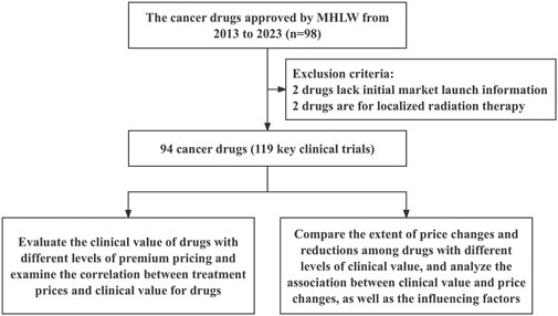 Flowchart showing cancer drug approval by MHLW from 2013 to 2023, totaling 98 drugs. Exclusion criteria removed 4 drugs, leaving 94 drugs across 119 key clinical trials. The chart splits into two paths: evaluating drugs' clinical value related to premium pricing, and comparing price changes based on clinical value and other factors.
