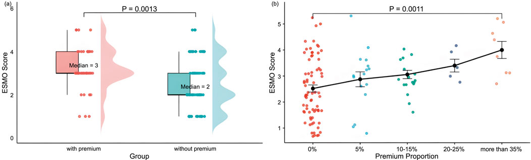 The median ESMO score was significantly higher in the premium group than in the non-premium group (3 vs. 2, P = 0.0013). Drugs were categorized into five groups based on the premium percentage: 0%, 5%, 10%–15%, 20%–25%, and ≧30%. The results showed that the mean ESMO scores for these groups were 2.52, 2.88, 3.06, 3.40, and 4.00, respectively. ESMO scores tended to increase significantly with the increase in the addition percentage, and a notable difference was observed between the non-premium group and the ≥30% premium group (median: 2 vs. 4; P = 0.0011) (Figure 2).