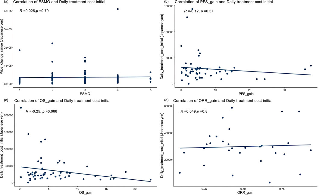 Among the 73 pivotal randomized controlled trials (RCTs), PFS data were available in 55 (75.34%), the PFS gain ranged from 0.1% to 37.7%, and OS data in 57 (78.08%), OS gain ranged from 0.2% to 22.7%. Pearson analysis showed no correlation between PFS gain, OS gain and daily treatment cost (r = −0.12, P = 0.37; r = −0.25, P = 0.066). Further analysis based on whether add-on therapy was administered, Pearson results indicated, with premium and without premium, respectively, no correlation PFS gain (r = −0.073, P = 0.67; r = −0.16, P = 0.5), and OS gain (r = −0.36, P = 0.082; r = −0.063, P = 0.73) all exhibited weak negative correlations with daily treatment costs.