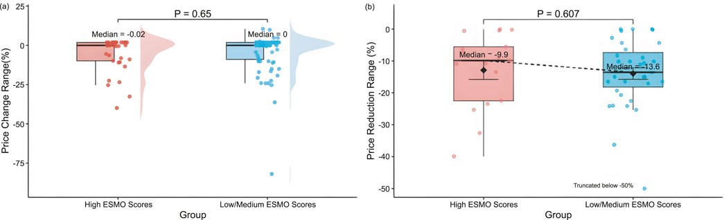 Figure 4. Distribution of (a) price revision magnitude by ESMO score Groups (High, 4-5 points (n = 33); Low/Medium, 1-3 points (n = 86)), and (b) price reduction range by ESMO score groups (High, 4-5 points (n = 17); Low/Medium, 1-3 points (n = 35)).