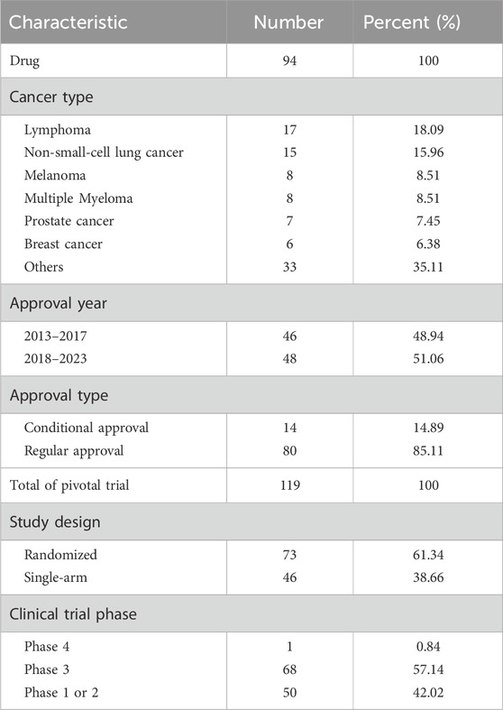 94 anticancer drugs and their associated 119 pivotal clinical trials were included in this study (Figure 1). Among all the sampled drugs, the most common indication was lymphoma (n = 17, 18.09%), followed by non-small cell lung cancer (n = 15, 15.96%). Regarding approvals, 46 (48.94%) and 48 (51.06%) of the drugs were approved for anticancer indications between 2013–2017 and 2018–2023, respectively. Most indications were approved through routine approval (n = 80, 85.11%). Regarding pivotal clinical trial design, 61.34% used randomized controlled trials, and 38.66% used single-arm trials. Most of the pivotal clinical trials for anticancer drugs were distributed in phase III clinical trials (n = 68, 57.14%) (Table 1).