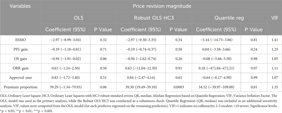 To test the robustness of the main model, we constructed several sensitivity analyses. Firstly, we re-estimated the main regression model using ordinary least squares (OLS), incorporating heteroscedasticity-robust standard errors (HC3 correction) to mitigate potential Type I error risks. Secondly, median quantile regression was employed to assess the robustness of estimation outcomes across varying distribution positions. Findings demonstrated that conclusions under different model specifications remained consistent with the primary analysis: neither the ESMO score nor other controlled variables exhibited significant correlation with the magnitude of price revision (Supplementary Table S1), thereby further enhancing the credibility of the research findings. Additionally, in the regression model, the variables’ variance inflation factors (VIF) are all less than 1.5, indicating that the model does not have serious multicollinearity problems and that the model estimation results have good robustness.
