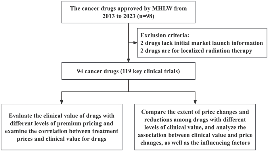 Given that Japan implements a biennial drug price revision system in principle, this study involves both initial pricing and subsequent price revision. We obtained information on newly approved cancer drugs from the Pharmaceuticals and Medical Devices Agency (PMDA) between January 2013 and March 2023. We reviewed the latest labels published by the Ministry of Health, Labour, and Welfare (MHLW, 2025b) and selected indications approved for the first time during this period.