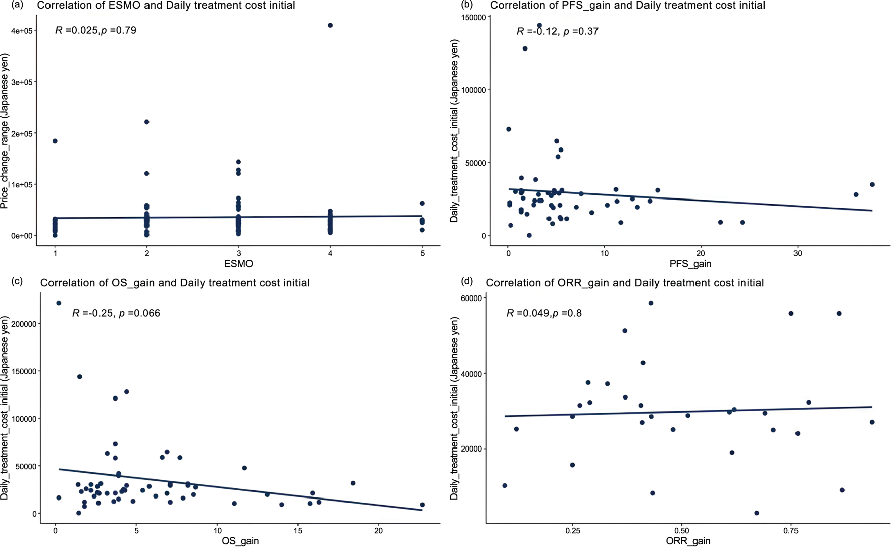Correlation between cancer therapy daily costs and percentage improvement in (a) ESMO scores (n = 119), (b) progression-free survival (PFS) of randomized controlled trials (n = 55), (c) overall survival (OS) of randomized controlled trials (n = 57), and (d) objective response rate (ORR) of single-arm trials (n = 31).