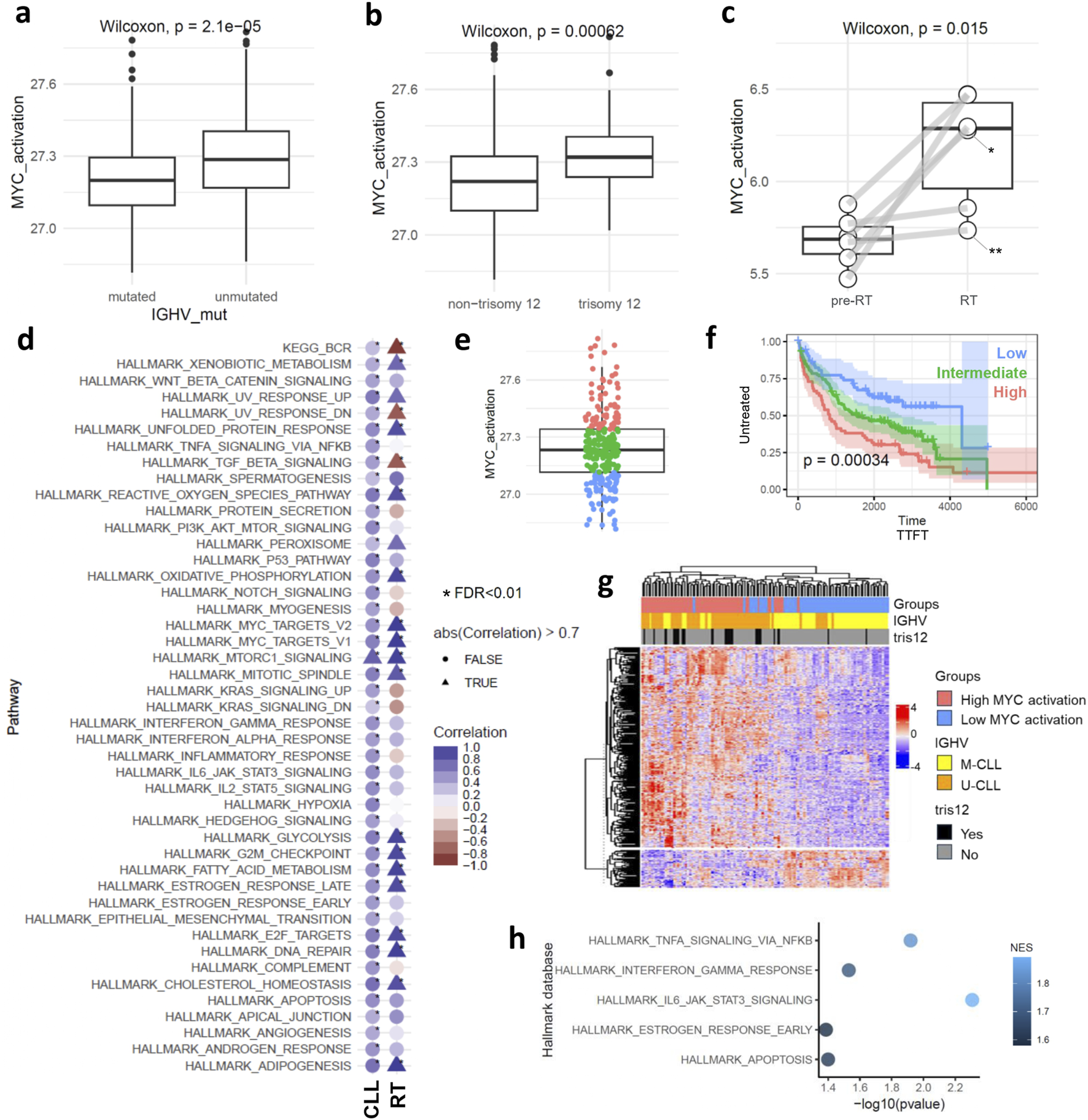 MYC target gene activation at bulk level. Boxplots showing MYC target gene activation score in: (a) mutated and unmutated CLL cases, (b) cases carrying or not carrying trisomy 12, (c) pre-RT and in RT phase. Asterisks indicate cases with MYC genetic alteration: *translocation, **missense mutation. (d) Dot plot displaying the correlation between MYC target gene activation scores and the scores of other biological processes in CLL and RT phases. Triangles highlight correlations higher than |0.7| L, while circles represent the others. Asterisks indicate correlations with FDR < 0.01, and the color scale represents the correlation coefficient. (e) Boxplot showing the unbiased separation of the CLL cohort into the three subgroups of MYC target gene activation. (f) Kaplan-Meier curve analysis using TTFT for the high, intermediate, and low subgroups of MYC target gene activation. (g) Hierarchical clustering is based on the 370 differentially expressed genes between low and high MYC target gene activation. (h) Pathway analysis using the 370 differentially expressed genes between low and high MYC target gene activation.