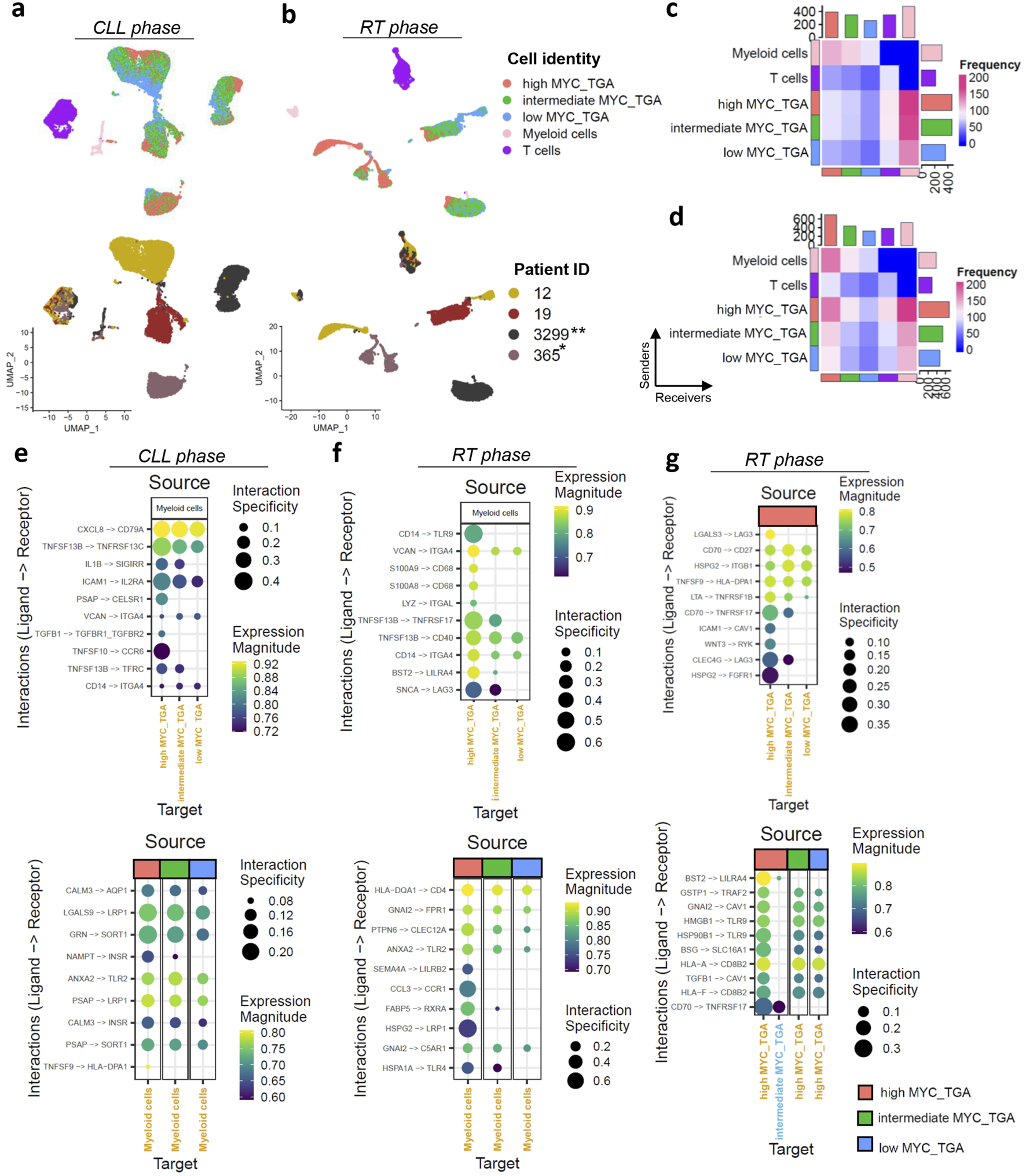 MYC target gene activation (MYC_TGA) at single-cell resolution level. (a,b) The UMAPs plot displaying the cell identity (malignant cells grouped based on MYC target genes activation together with the TME, upper UMAPs) and across the different patients (lower UMAPs) in (a) CLL and (b) RT phase. The samples were paired in CLL and RT phase derived from the same patients (n = 6) and collected at different time points (T1–T6). Asterisks indicate cases with MYC genetic alteration: *translocation, **missense mutation. (c,d) Heatmaps showing the interactions of cells with different cell identities in (c) CLL and (d) RT phase. The interactions between myeloid and T cells were excluded to focus on the analysis of the malignant cells. (e–g) Dot plots display ligand-receptor interactions in (e)MYC target gene activation categories with myeloid cells in the CLL phase, (f)MYC target gene activation categories with myeloid cells in the RT phase, and (g) interactions within MYC target gene activation categories in the RT phase. For panels (e,f), two plots are shown: one with myeloid cells as ligand-expressing cells and the other with myeloid cells as receptor-expressing cells. The size of each dot represents the interaction specificity, while the color indicates the expression magnitude. The identities of the cells were used both as sources and targets.