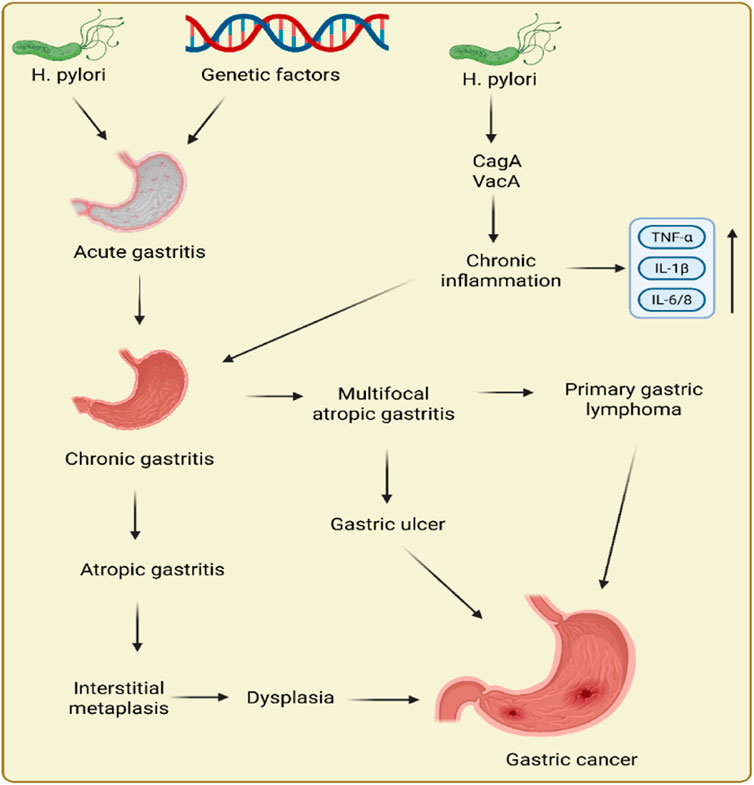Epidemiologic and experimental data support the causal role of H. pylori infection in GC. Several factors interact to determine whether the infection will cause multifocal atrophic gastritis or non-atrophic gastritis. The latter is the precancerous cascade’s first stage. Robin Warren and Barry Marshall received the Nobel Prize in Physiology or Medicine in 2005 for their revolutionary study connecting infection of H. pylori to GC and peptic ulcer (Charitos et al., 2021). It has been established that the potential of H. pylori to induce GC is correlated with its virulence, which is mostly influenced by the vacuolating toxin VacA and cytotoxin CagA (Sharndama and Mba, 2022). Intestinal metaplasia, serious gastritis, GC, and cytotoxin CagA have all been associated with vacAs1m1- and CagA-positive bacterial genotypes (Kishk et al., 2021). VaccinAs2m2 genotypes that are CagA-negative cause less infection, they cause a milder form of non-atrophic gastritis, and neoplastic outcomes are not always the consequence (Park J. Y. et al., 2018). In addition to H. pylori, there are various other factors, such as radiation, genetic factors, hypoxia, etc., that can lead to the development of GC. Figure 1 displays the pathogenesis of GC.