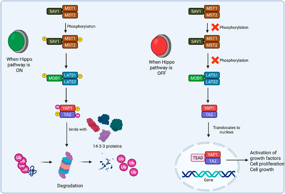 A tumor-suppressive mechanism called the Hippo signaling pathway controls tissue growth and restricts the size of organs by preventing proliferation, encouraging apoptosis, and preventing cell growth (Saadh et al., 2025). Once inactivated, the pathway’s downstream elements, like Yes-associated protein 1 (YAP1) and transcriptional co-activator with PDZ binding motif (TAZ), become active and ultimately cause tumorigenesis (Zhao et al., 2023). Under typical conditions, Last1, WW45, Mst1, Mob, and the upstream molecules of the Hippo signaling pathway in mammals frequently create a conserved kinase cassette (Xiao and Dong, 2021). In response to cell density, these molecules can cause phosphorylation and deactivate the YAP/TAZ complex, which is present on a variety of HxRxxS motifs, the most important of which include TAZ S89 and YAP S127. They act as a 14-3-3-binding site and control nucleus-cytoplasmic translocation (Pan, 2010). The transcriptional enhancer factor TEF-1 (TEAD) family of transcription factors will work in conjunction with YAP to control cell development and apoptosis after it enters the nucleus. Figure 2 displays the Hippo on and off pathway in cancer. Three more core molecules are phosphorylated by Mst1 in mammals. Mst1 phosphorylates Lats1 on the hydrophobic motif and activation loop and may involve auto-phosphorylation (Zhao et al., 2008). The shifting of the cytoplasm-nucleus is important in cell growth regulation in response to density and cell-to-cell contact. The nuclear translocation of YAP/TAZ caused by the inactivation of the Hippo signaling system promoted cell proliferation, suppressed cell apoptosis, and ultimately resulted in cancer (Dong et al., 2019).