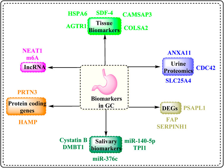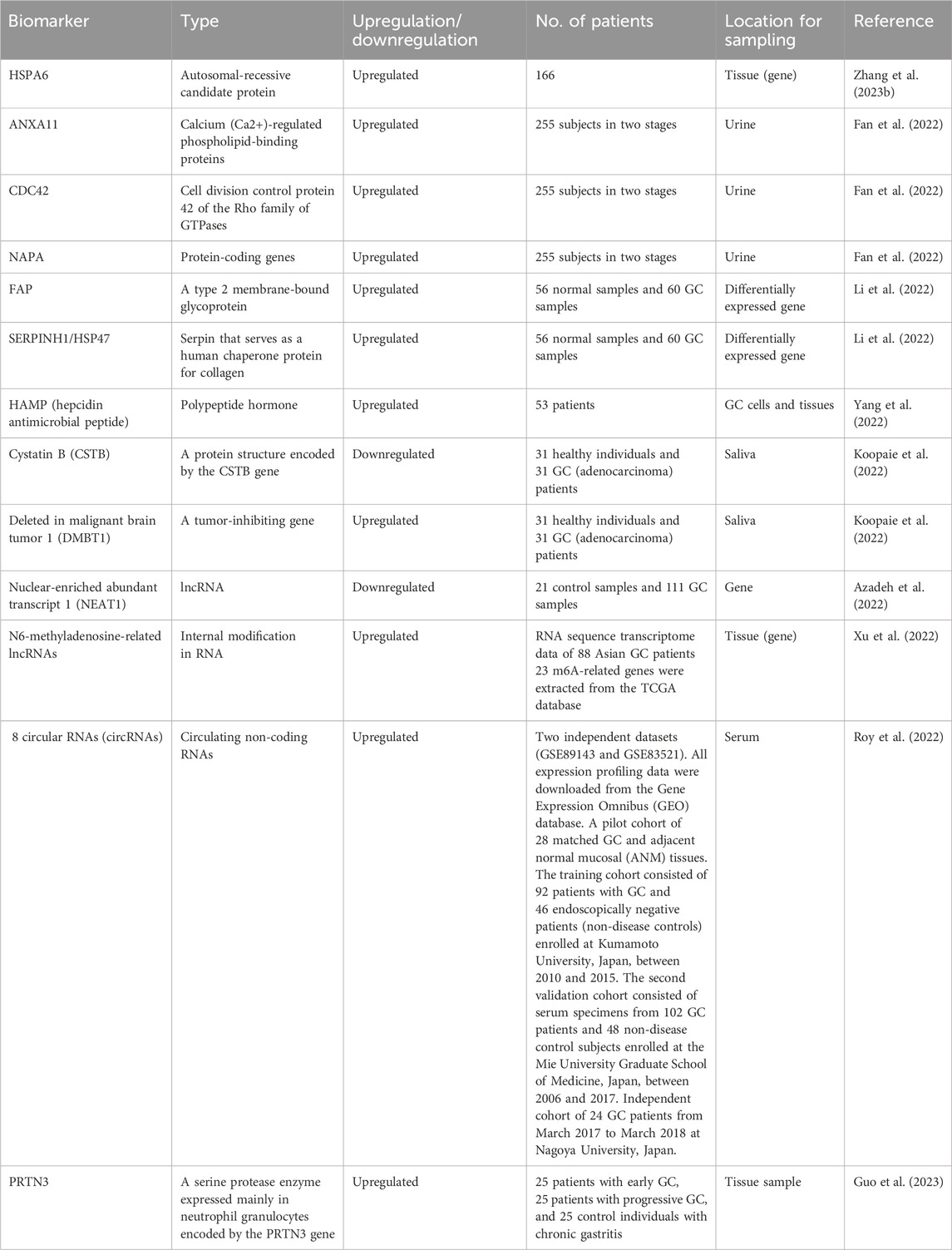According to the Ming classification, which corresponds to the Bormann classification (protrusion and ulcer type), the Lauren classification (intestinal and diffuse type), and the WHO classification (papillary adenocarcinoma, adenosquamous carcinoma, squamous cell carcinoma, carcinoid, etc.), GC is separated into infiltrative GC (IGC) and expanding GC (EGC) (Luebke et al., 2005). IGC occurs 61.5% of the time and has a worse prognosis than EGC (Zhang L. et al., 2023). Biomarkers are traits that can be objectively examined and assessed to serve as markers for normal biological processes, pathogenic processes, or pharmacological responses to therapeutic interventions (Smyth et al., 2020). It is understandable why the field of GC biomarkers has drawn so much attention. Some indicators of GC-related DNA, RNA, and exosomes have been found in recent investigations. Despite advancements in diagnostic and therapeutic techniques, the prognosis for GC patients remains poor, largely due to late-stage diagnosis and high rates of recurrence and metastasis. In recent years, the exploration of molecular biomarkers has gained significant attention for their potential to improve early detection, monitor disease progression, and guide personalized treatment strategies (Hanash et al., 2011; Sethi et al., 2013). Biomarkers are measurable indicators of biological or pathological processes and can be detected in tissue, blood, or other bodily fluids (Ahmad et al., 2023). They offer valuable insights into the molecular alterations involved in gastric tumor initiation, progression, immune evasion, and response to therapy (Carlomagno et al., 2017).