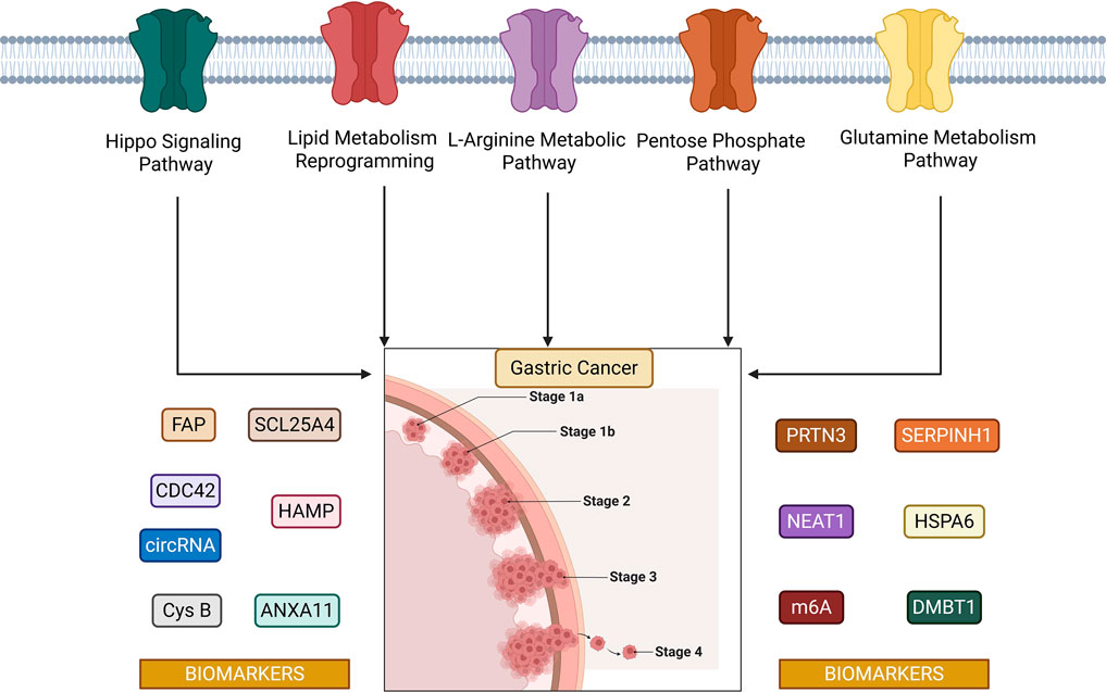 Several metabolic and signaling pathways are intricately involved in the pathogenesis of GC, and their dysregulation often results in molecular alterations that can be exploited as potential diagnostic and prognostic biomarkers. Rather than describing these pathways in isolation, it is essential to understand how specific changes within them give rise to quantifiable molecular signatures. For instance, lipid metabolism reprogramming is a recognized hallmark of cancer that supports membrane biosynthesis, energy storage, and signaling in rapidly proliferating tumor cells (Yang et al., 2023). In GC, upregulation of enzymes such as fatty acid synthase (FASN) and transcription factors like SREBP1 has been reported, and both are emerging as tissue-based biomarkers associated with tumor progression and poor prognosis (Fernandez et al., 2020). Similarly, the glutamine metabolism pathway is frequently altered in GC to meet the high biosynthetic demands of cancer cells. Increased expression of glutaminase (GLS1) and the glutamine transporter SLC1A5 has been observed in tumor tissues, suggesting their potential utility as metabolic biomarkers for early GC detection (Zhong et al., 2023). The pentose phosphate pathway (PPP) plays a vital role in maintaining redox balance and supplying nucleotides for DNA synthesis. Overexpression of glucose-6-phosphate dehydrogenase (G6PD) in GC is associated with oxidative stress adaptation and tumor aggressiveness, positioning it as a candidate prognostic biomarker (Zhang C. et al., 2014). The L-arginine metabolic pathway, important in modulating immune cell function and nitric oxide production, has also been implicated in GC. Biomarkers such as arginase-1 (ARG1) and argininosuccinate synthase 1 (ASS1) are differentially expressed and contribute to immunosuppressive tumor microenvironments, offering insight into immune evasion mechanisms (Chen et al., 2021). Furthermore, the Hippo signaling pathway, which controls cell proliferation, contact inhibition, and apoptosis, is commonly dysregulated in GC. Aberrant activation of YAP1, the key transcriptional co-activator of this pathway, promotes oncogenic transcriptional programs and is being evaluated as both a tissue and circulating biomarker for prognosis (Zhu et al., 2015; Messina et al., 2023). By establishing these molecular connections between dysregulated pathways and specific biomarkers, this section underscores the relevance of pathway-derived biomarker discovery and strengthens the translational value of such markers in the early detection and clinical management of GC.