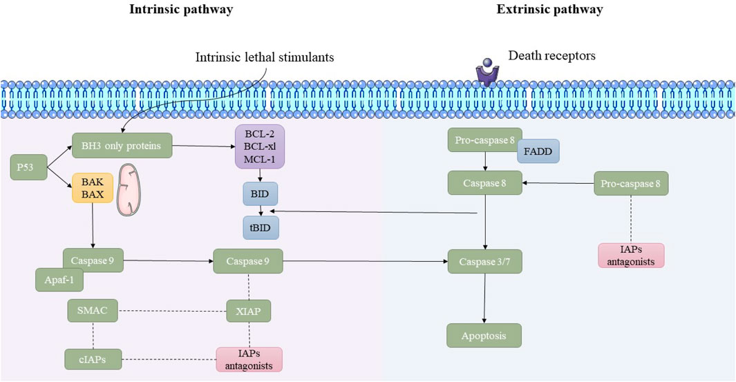 Figure 1. Overview of the intrinsic and extrinsic apoptosis pathways. This schematic illustrates the molecular mechanisms underlying the intrinsic and extrinsic pathways of apoptosis. The intrinsic pathway is initiated by lethal cellular stress, leading to p53-mediated activation of pro-apoptotic BAK/BAX proteins and mitochondrial outer membrane permeabilization (MOMP). This results in the release of cytochrome c and the activation of caspase-9 through apoptosome formation. In contrast, the extrinsic pathway is triggered by the binding of death ligands to death receptors, leading to FADD-mediated activation of caspase-8. Both pathways converge on the activation of executioner caspases-3/7, leading to apoptosis. Inhibitor of apoptosis proteins (IAPs) and their antagonists modulate the process.