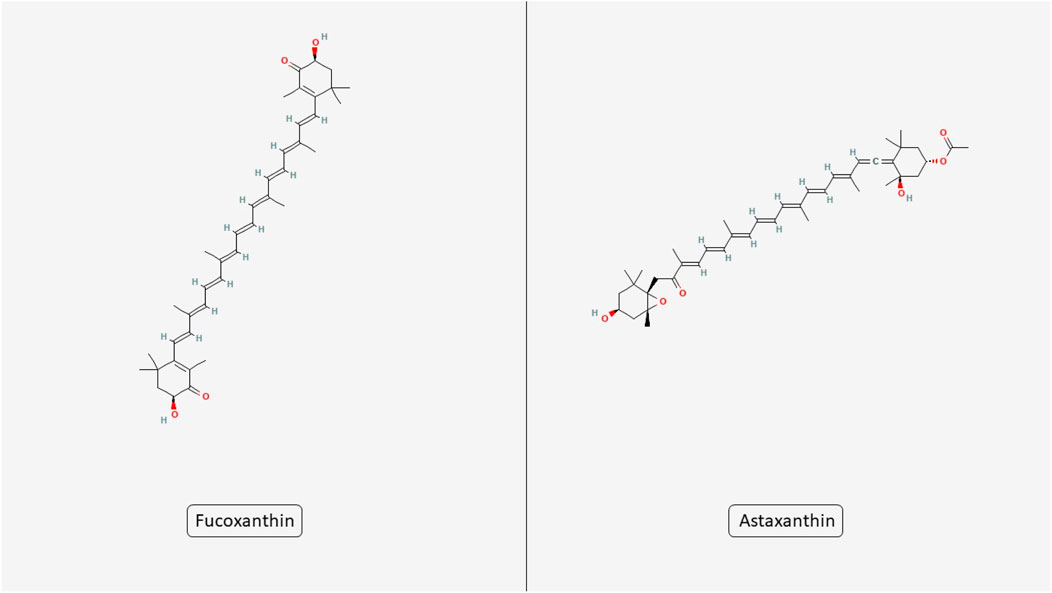 Figure 2. Chemical structures of microalgal carotenoids fucoxanthin and astaxanthin. The figure displays the molecular structures of two bioactive carotenoids derived from microalgae, fucoxanthin and astaxanthin.