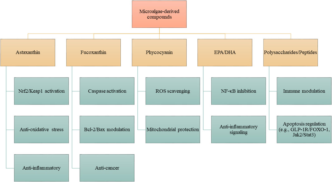 Figure 3. Proposed mechanisms of action of microalgae-derived compounds. Specific metabolites, including astaxanthin, fucoxanthin, phycocyanin, EPA/DHA, and polysaccharides/peptides, exert distinct pharmacological activities. These compounds modulate defined molecular pathways such as Nrf2/Keap1, NF-κB, Bcl-2/Bax, caspase cascades, and Jak2/Stat3, resulting in antioxidant, anti-inflammatory, anti-apoptotic, or neuroprotective effects. Effects are compound- and structure-dependent, rather than universal to all microalgae.