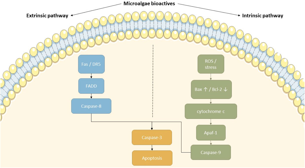 Consequently, there is an increasing demand for new therapeutic approaches that can selectively target apoptotic pathways within cancer cells while minimizing harm to healthy tissues. In the current framework, microalgae have appeared as promising natural sources of therapeutic agents. Microalgae are unicellular, photosynthetic microorganisms found in freshwater and marine environments, classified primarily into groups such as Chlorophyta (green algae), Bacillariophyta (diatoms), Cyanobacteria (blue–green algae), and others. They produce diverse secondary metabolites with ecological and pharmacological significance (Morais Junior et al., 2020). These photosynthetic microorganisms synthesize a wide range of bioactive metabolites, like polysaccharides, carotenoids, and polyphenols, many of which have demonstrated anticancer properties via the modulation of main molecular pathways, including apoptosis (Matin et al., 2024). Notably, bioactive compounds from microalgae have demonstrated pro-apoptotic effects in various cancer types, including breast, lung, liver, cervical, and leukemia models (Roshan Cheragh and Mabudi, 2023; Sawasdee et al., 2023; Hamai-Amara et al., 2024; Silva et al., 2024; Al-Shajrawi et al., 2025). Microalgae, including cyanobacteria such as Arthrospira platensis Gomont (Oscillatoriaceae) (commonly known as spirulina), are diverse photosynthetic microorganisms that have gained significant consideration as promising sources of bioactive complexes with important anticancer impacts. These compounds include carotenoids, polyphenols, lipids, and polysaccharides, which have been shown to influence various molecular pathways involved in apoptosis (Saide et al., 2021; Martínez-Ruiz et al., 2022). Microalgae-derived bioactive compounds are particularly appealing because they can modulate both intrinsic and extrinsic apoptotic molecular pathways, which are critical in the selective elimination of different cancer cells while sparing normal cells (Bouyahya et al., 2024; Talero et al., 2015). Additionally, microalgae-based compounds have demonstrated the ability to improve the effectiveness of conservative therapies by overcoming mechanisms like multidrug resistance, which often hampers the success of cancer treatments (Bouyahya et al., 2024; Ahirwar et al., 2022). Also, microalgae have therapeutic potential effects against mitochondrial dysfunction, oxidative stress, inflammation, and neuronal cell death, key pathogenic features of neurodegeneration (Shah et al., 2016). Microalgae produce a diverse array of metabolites, including polyunsaturated fatty acids (PUFAs), carotenoids, peptides, and polysaccharides, many of which exhibit neuroprotective effects by controlling apoptosis and enhancing neuroplasticity (Rosic, 2025). For instance, fucoxanthin (FX) from Phaeodactylum tricornutum Bohlin (Phaeodactylaceae) has shown the ability to visualize amyloid-beta (Aβ) plaques and potentially inhibit aggregation in Alzheimer’s models (Lee et al., 2021). Similarly, extracts from Desmodesmus have demonstrated antioxidant and anti-apoptotic effects in PD models by modulating mitochondrial function, reducing reactive oxygen species (ROS), and upregulating neuroprotective pathways (Derya-Andeden et al., 2025). These findings suggest that microalgal bioactives may simultaneously regulate apoptotic pathways and promote neural regeneration, offering a dual-action approach for neurodegenerative disease therapy.