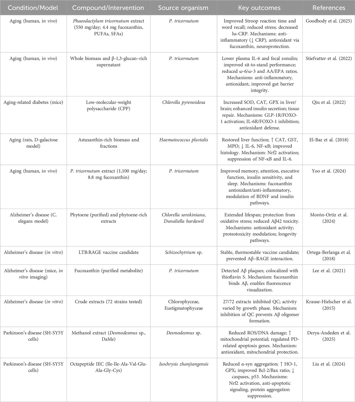 Table 1. Summary of studies on microalgal bioactives in aging and neurodegenerative models. Compounds are specified as purified metabolites, enriched fractions, or whole biomass extracts.