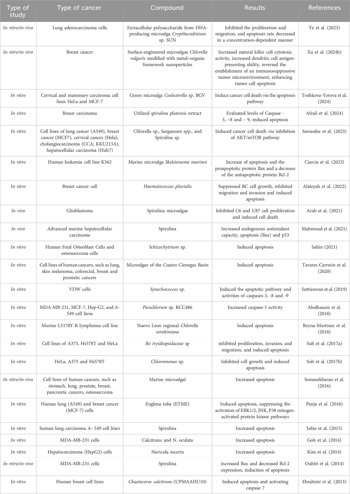 Alternative and efficient therapies are necessary since drug resistance and recurrence following existing conventional treatments are common. Crude polysaccharide and ethanolic extracts from Chlorella sp., Sargassum spp., and Spirulina sp. were studied for their anti-cancer properties against cell lines of five of the most common cancers: cervical cancer (Hela), breast cancer (MCF7), lung cancer (A549), cholangiocarcinoma (CCA; KKU213A), and hepatocellular carcinoma (Huh7). Flow cytometric research showed that the apoptosis pathway caused CCA cell death along with a reduction in procaspase-3, -8, and -9, an elevation in caspase enzymatic activity, and a decrease in anti-apoptosis Bcl-2 protein. Interestingly, phosphorylated-mTOR and phosphorylated-AKT proteins were significantly reduced after the extract treatment, indicating a strong reserve of AKT/mTOR survival signaling. Treatment with lutein and gallic acid significantly decreased the vitality of KKU100, KKU055, and KKU213A cells (Sawasdee et al., 2023). A myeloproliferative condition called chronic myeloid leukemia causes cells to create more ROS by activating many signaling pathways. Marine natural products have confirmed potential actions for the treatment of hematological malignancies, and nicotinamide adenine dinucleotide phosphate (NADPH) oxidases (NOXs) are a primary source of ROS in leukemia. Another research examined how the human leukemia cell line K562 was affected by the microalga Skeletonema marinoi Sarno and Zingone (Skeletonemataceae). After 48 h of treatment, S.M. was able to raise apoptosis levels and reduce cell viability in K562 cells. Furthermore, in K562-treated cells, SOD, CAT, and GPX levels rose while those of nitric oxide, NOX, and malondialdehyde decreased. Lastly, examining the gene expression of the proapoptotic protein Bax and the antiapoptotic protein Bcl-2, it was discovered that the K562-treated cells had a markedly higher level of Bax and a persistently lower level of Bcl-2 (Ciarcia et al., 2022).