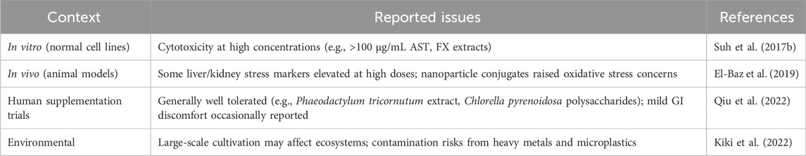 Despite growing interest in microalgae-based compounds, significant translational barriers remain that must be addressed to advance these findings toward clinical application. Microalgae-derived bioactive compounds have gained significant attention in recent years due to their potential to modulate apoptosis and inhibit tumor growth. Despite encouraging findings from numerous in vitro and in vivo studies, several critical challenges remain before these compounds can be effectively translated into clinical settings. One of the major challenges is the bioavailability and pharmacokinetics of these compounds. Many of them, particularly carotenoids like AST and FX, are poorly soluble in water and are rapidly metabolized in the body (Oninku et al., 2025). This limits their absorption and reduces their therapeutic efficacy. Current research is exploring ways to overcome these limitations, such as using lipid-based carriers or nanoformulations to improve stability and delivery. However, more work is needed to develop formulations that are both effective and suitable for human use. In addition to pharmacokinetic limitations, reported adverse effects and safety concerns must be considered. Some studies noted cytotoxicity to normal cells at higher doses, while others highlighted risks from nanoparticle-based delivery systems (Table 3).