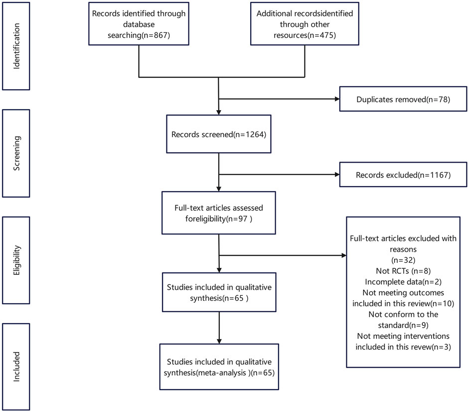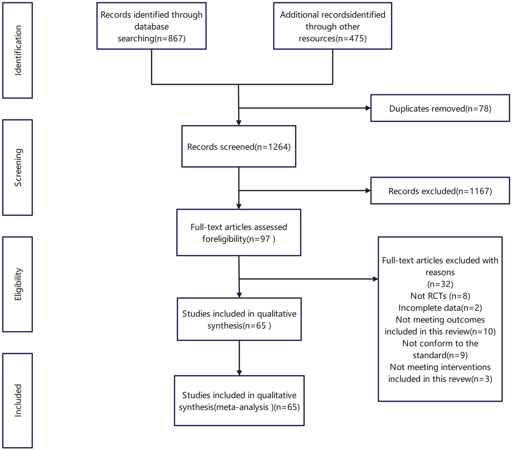 A total of 1,342 studies were initially retrieved, and after removing duplicates and screening titles and abstracts, 97 studies were shortlisted for full-text review as shown in Figure 1. Ultimately, 65 studies (Wu et al., 2001; Tong et al., 2001; Zhongtian and Rihui, 2001; Jian and Xudong, 2002; Jing et al., 2002; Taojin, 2002; Xianming et al., 2002; Yuxia et al., 2002; Zehong et al., 2002; Chunjian et al., 2003; Haijie and Changshi, 2003; Jinghe, 2003; Linfeng, 2003; Yanhong et al., 2003; Junjiang et al., 2004; Shaohua, 2004; Sujuan and Haijun, 2004; Lifang and Guofeng, 2005; Shougang, 2005; Xiaoyan and Bainian, 2006; Zhi-Min et al., 2006; Chunyan, 2007; Dongsheng and Jimin, 2008; Qingfan and Hezhong, 2008; Tangheng, 2008; Rongxing and Linlin, 2009; Shugang et al., 2009; Weidong and Lihua, 2009; Yunhai, 2009; Changming, 2010; Cuixia and Cunji, 2010; Haiyan, 2010; Shiyao, 2010; Xiaojun, 2010; Yong, 2010; Jun et al., 2011; Leilei, 2011; Quanyou, 2011; Shaofeng and Xinfeng, 2011; Xiao-Mei, 2011; Yongchao et al., 2011; Haiqing, 2012; Jinbao et al., 2012; Tingguo et al., 2012; Xinnian and Lu, 2012; Jinliang and Yunyi, 2013; Wei et al., 2013; Yu, 2013; Zongsheng, 2013; Cailiang et al., 2014; Sujuan et al., 2014; Yanbo, 2014; Youjun, 2014; Xuexu et al., 2014; Hongying et al., 2015; Zhaomei and Lian, 2015; Zhijing et al., 2016; Hongying et al., 2016; Jianmin et al., 2016; Mao and Qiang, 2017; Zhixue et al., 2017; Wenhui and Shiliang, 2019; Wenhua et al., 2020; Fei, 2021; Laiqiang, 2021), involving 7,221 patients, met the inclusion criteria.