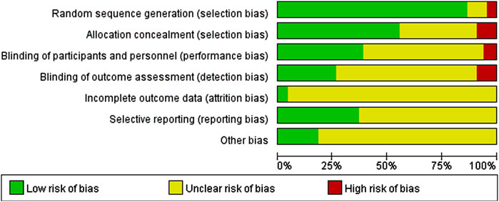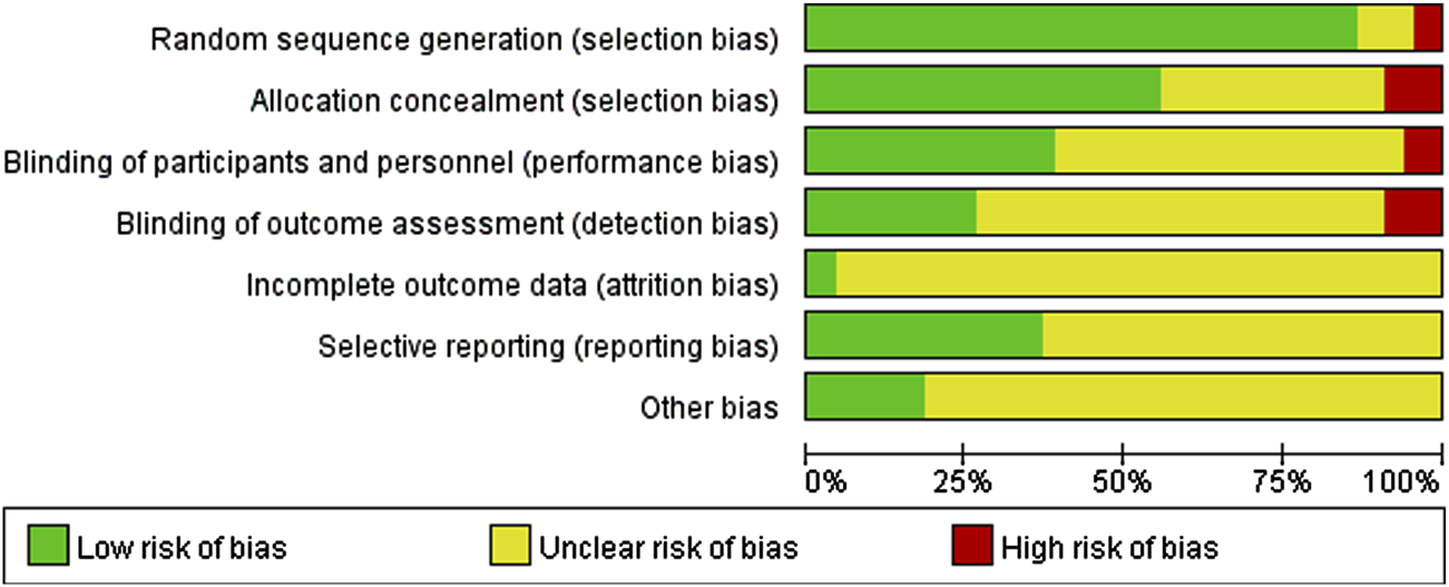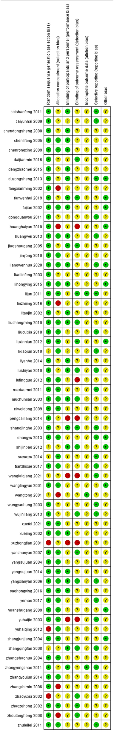 Among the 65 included studies, 56 studies were low-risk, 6 studies only mentioned randomization, but did not specify the random allocation method, rated as unclear risk, and 3 studies did not mention it. In terms of allocation concealment, 38 studies were rated as low risk, 6 studies did not give clear allocation as high risk, and the remaining 23 studies did not mention allocation concealment as unclear risk. In terms of research blinding, 25 studies mentioned it, 36 studies did not mention it, and 4 studies were rated as high risk because they could not be blinded due to different types of interventions included in the studies. In terms of completeness of outcome indicators, 17 items clearly stated that there was no loss of follow-up and were rated as low risk. Six items mentioned loss of follow-up, which was rated as high risk. The remaining 42 did not mention loss to follow-up and were rated as unclear risk. Data were reported selectively; 24 were low-risk and 41 were high-risk. Other risks of bias were only mentioned in 12 articles, and the rest were unclear. The risk of bias assessment of the included studies is shown in Figures 2, 3.