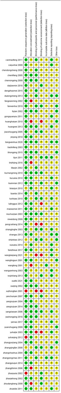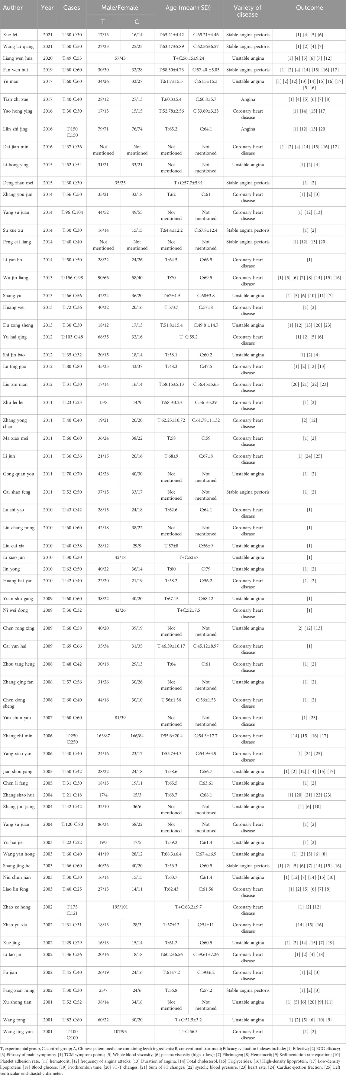 The studies included patients with stable or unstable angina, with a mean age of 50–70 years in most studies. Of the 65 studies, 31 primarily focused on coronary heart disease (Wu et al., 2001; Jian and Xudong, 2002; Taojin, 2002; Yuxia et al., 2002; Zehong et al., 2002; Linfeng, 2003; Sujuan and Haijun, 2004; Xiaoyan and Bainian, 2006; Zhi-Min et al., 2006; Chunyan, 2007; Dongsheng and Jimin, 2008; Tangheng, 2008; Weidong and Lihua, 2009; Yunhai, 2009; Changming, 2010; Haiyan, 2010; Shiyao, 2010; Jun et al., 2011; Leilei, 2011; Xiao-Mei, 2011; Yongchao et al., 2011; Haiqing, 2012; Tingguo et al., 2012; Xinnian and Lu, 2012; Jinliang and Yunyi, 2013; Wei et al., 2013; Sujuan et al., 2014; Yanbo, 2014; Youjun, 2014; Hongying et al., 2016; Jianmin et al., 2016), 23 on unstable angina (Tong et al., 2001; Zhongtian and Rihui, 2001; Jing et al., 2002; Chunjian et al., 2003; Haijie and Changshi, 2003; Yanhong et al., 2003; Junjiang et al., 2004; Shaohua, 2004; Lifang and Guofeng, 2005; Shougang, 2005; Qingfan and Hezhong, 2008; Rongxing and Linlin, 2009; Shugang et al., 2009; Cuixia and Cunji, 2010; Xiaojun, 2010; Yong, 2010; Quanyou, 2011; Jinbao et al., 2012; Yu, 2013; Zongsheng, 2013; Hongying et al., 2015; Mao and Qiang, 2017; Wenhua et al., 2020), 9 on stable angina pectoris (Xianming et al., 2002; Jinghe, 2003; Shaofeng and Xinfeng, 2011; Cailiang et al., 2014; Xuexu et al., 2014; Zhaomei and Lian, 2015; Wenhui and Shiliang, 2019; Fei, 2021; Laiqiang, 2021) and 2 on general angina symptoms (Zhijing et al., 2016; Zhixue et al., 2017). The detailed basic characteristics of the included studies are shown in Table 2.