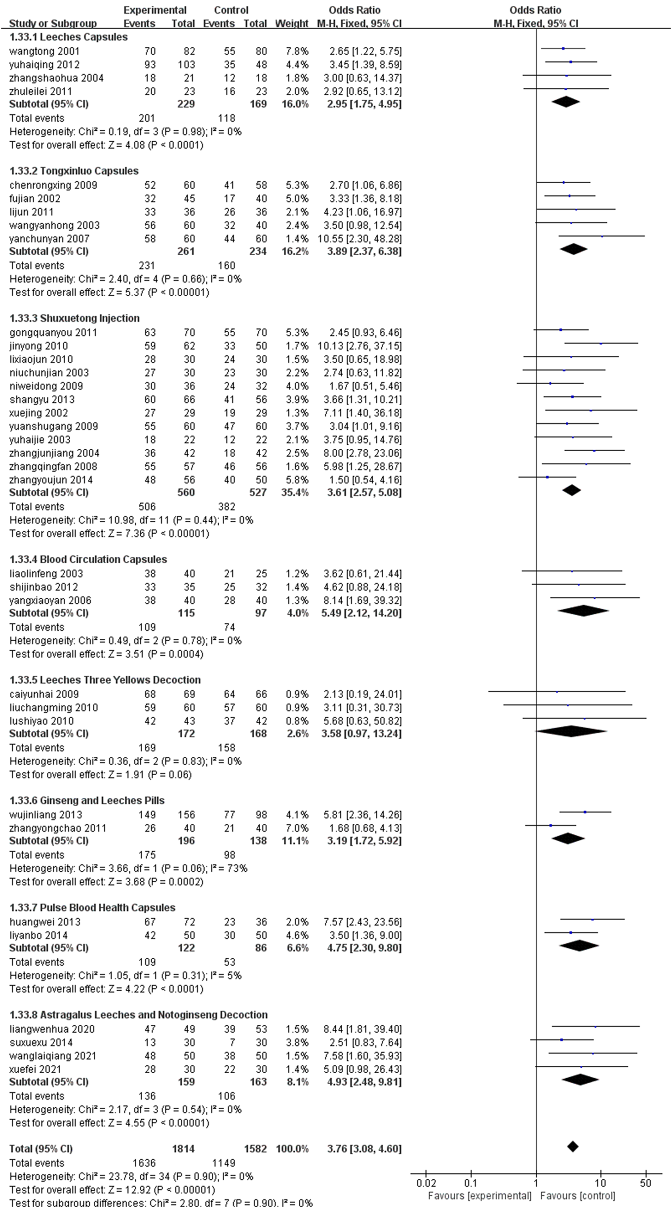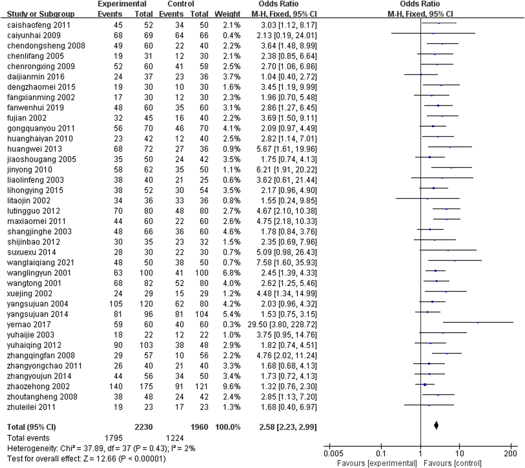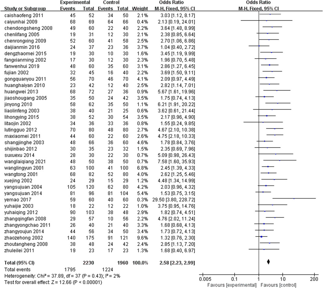 Thirty eight studies (Wu et al., 2001; Tong et al., 2001; Jian and Xudong, 2002; Jing et al., 2002; Taojin, 2002; Xianming et al., 2002; Zehong et al., 2002; Haijie and Changshi, 2003; Jinghe, 2003; Linfeng, 2003; Sujuan and Haijun, 2004; Lifang and Guofeng, 2005; Shougang, 2005; Dongsheng and Jimin, 2008; Qingfan and Hezhong, 2008; Tangheng, 2008; Rongxing and Linlin, 2009; Yunhai, 2009; Haiyan, 2010; Yong, 2010; Leilei, 2011; Quanyou, 2011; Shaofeng and Xinfeng, 2011; Xiao-Mei, 2011; Yongchao et al., 2011; Haiqing, 2012; Jinbao et al., 2012; Tingguo et al., 2012; Wei et al., 2013; Sujuan et al., 2014; Youjun, 2014; Xuexu et al., 2014; Hongying et al., 2015; Zhaomei and Lian, 2015; Jianmin et al., 2016; Mao and Qiang, 2017; Wenhui and Shiliang, 2019; Laiqiang, 2021) (n = 4,190) reported the ECG efficacy after treatment. The results of meta-analysis under fixed effects model (I2 = 2%, P < 0.0001) showed that the group containing leech Chinese medicine combined with conventional treatment had better ECG efficacy after treatment, and the difference was statistically significant [OR = 2.58, 95%CI (2.23, 2.99), P < 0.0001] (Figure 5).